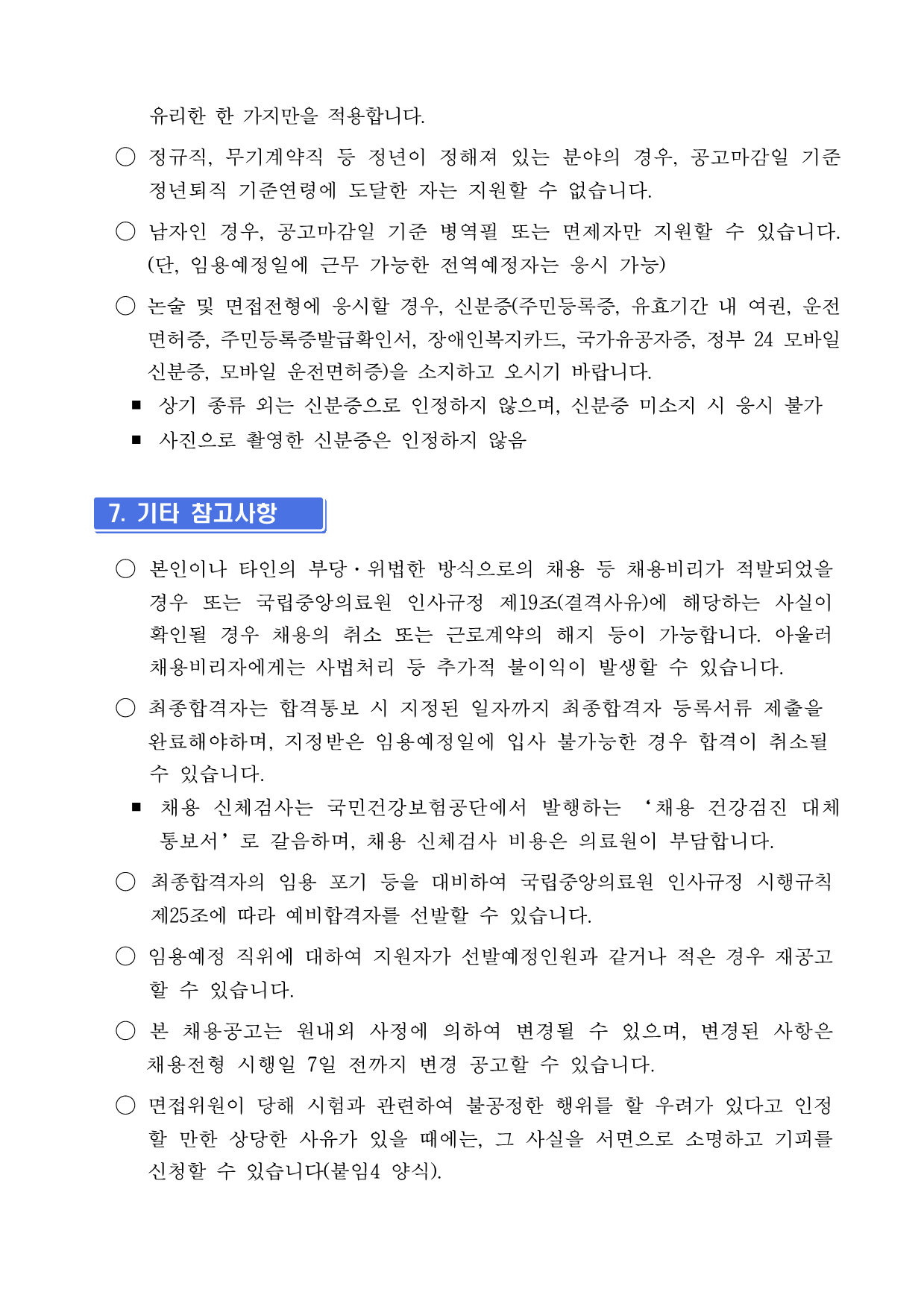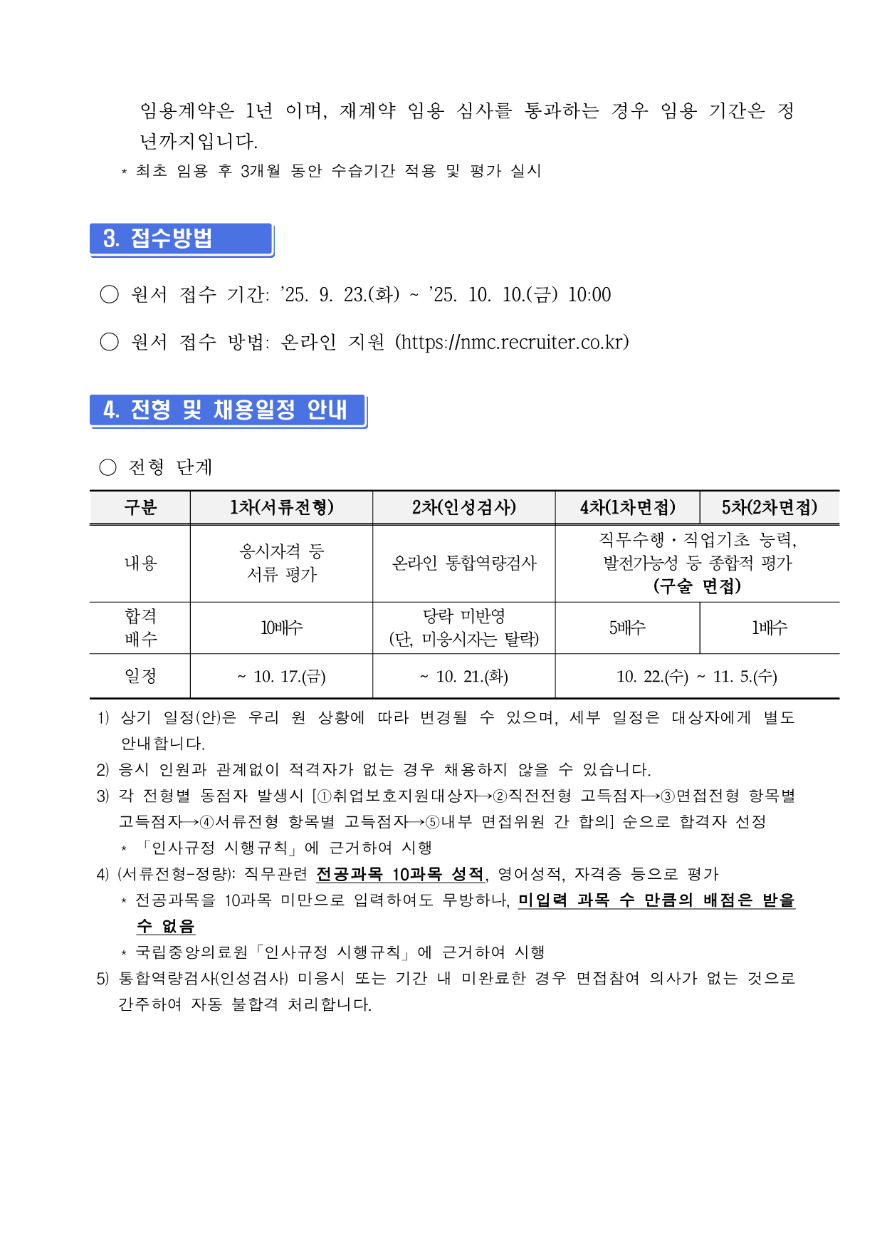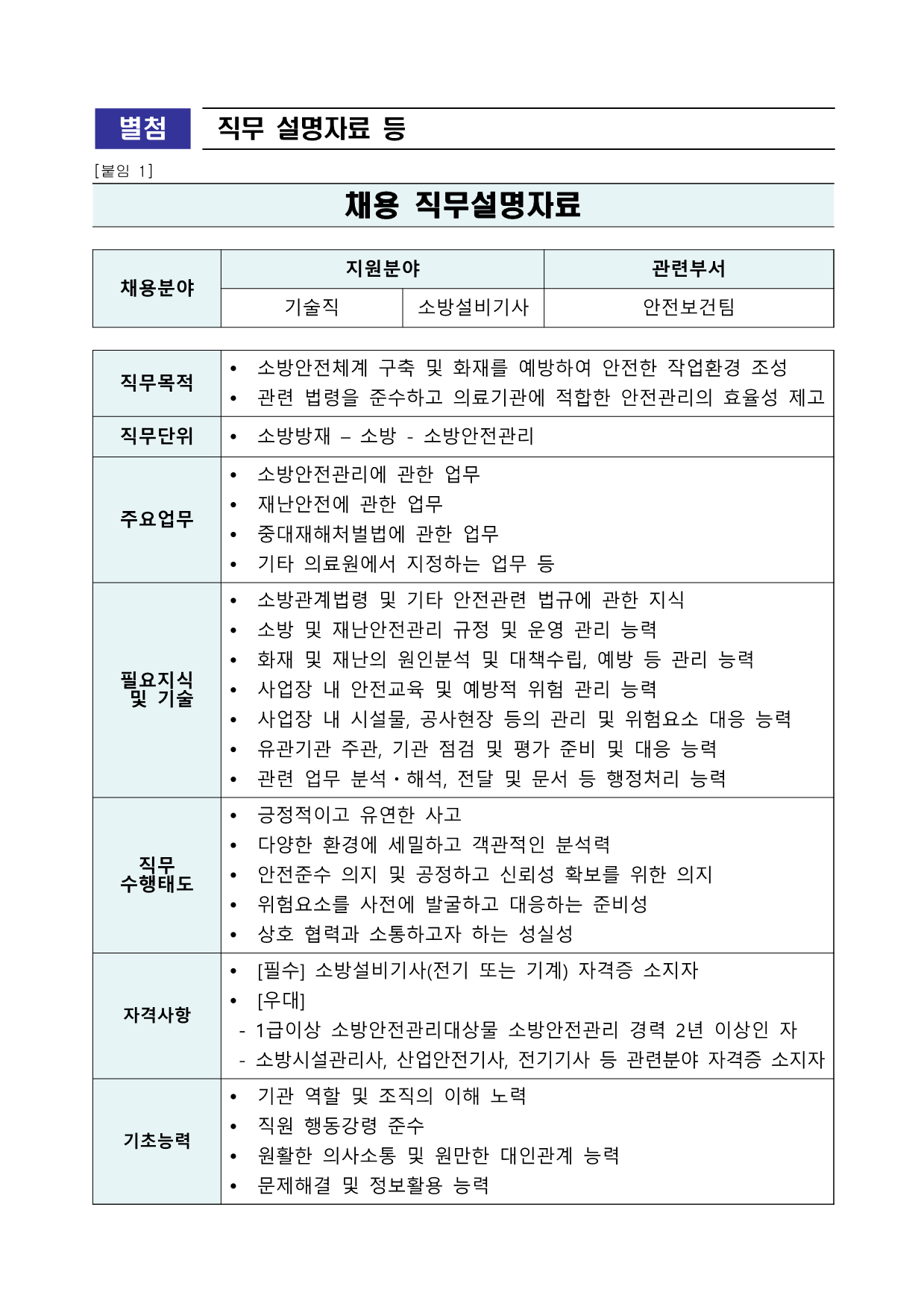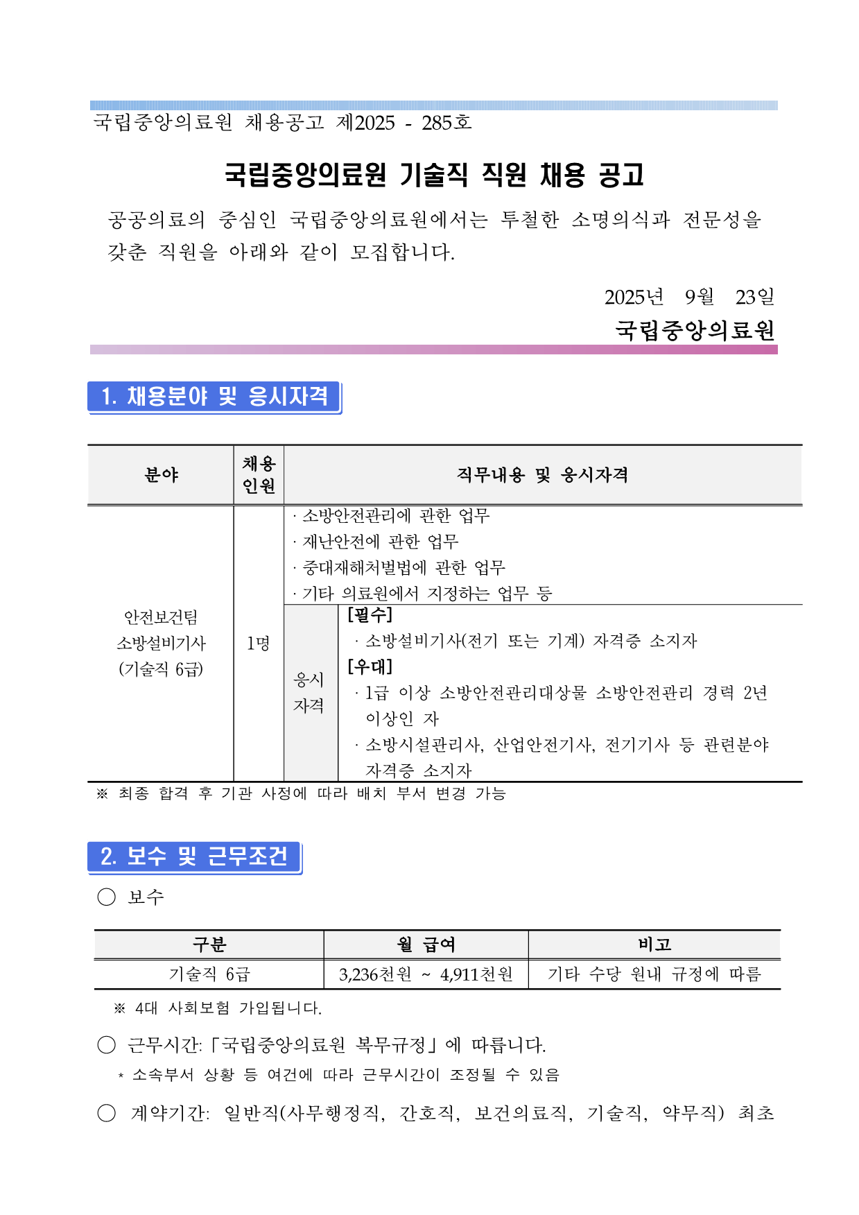 ±¹¸³Áß¾ÓÀÇ·á¿ø ä¿ë°ø°í Á¦2025 - 285È£ ±¹¸³Áß¾ÓÀÇ·á¿ø ±â¼úÁ÷ Á÷¿ø ä¿ë °ø°í °ø°øÀÇ·áÀÇ Áß½ÉÀÎ ±¹¸³Áß¾ÓÀÇ·á¿ø¿¡¼´Â ÅõöÇÑ ¼Ò¸íÀǽİú Àü¹®¼ºÀ»°®Ãá Á÷¿øÀ» ¾Æ·¡¿Í °°ÀÌ ¸ðÁýÇÕ´Ï´Ù. 2025³â 9¿ù 23Àϱ¹¸³Áß¾ÓÀÇ·á¿ø1. ä¿ëºÐ¾ß ¹× ÀÀ½ÃÀÚ°Ý ºÐ¾ß ä¿ë Àοø Á÷¹«³»¿ë ¹× ÀÀ½ÃÀÚ°Ý ¾ÈÀüº¸°ÇÆÀ ¼Ò¹æ¼³ºñ±â»ç (±â¼úÁ÷ 6±Þ) 1¸í ¤ý¼Ò¹æ¾ÈÀü°ü¸®¿¡ °üÇÑ ¾÷¹« ¤ýÀç³¾ÈÀü¿¡ °üÇÑ ¾÷¹« ¤ýÁß´ëÀçÇØÃ³¹ú¹ý¿¡ °üÇÑ ¾÷¹« ¤ý±âŸ ÀÇ·á¿ø¿¡¼ ÁöÁ¤ÇÏ´Â ¾÷¹« µî ÀÀ½Ã ÀÚ°Ý [Çʼö] ¤ý¼Ò¹æ¼³ºñ±â»ç(Àü±â ¶Ç´Â ±â°è) ÀÚ°ÝÁõ ¼ÒÁöÀÚ [¿ì´ë] ¤ý1±Þ ÀÌ»ó ¼Ò¹æ¾ÈÀü°ü¸®´ë»ó¹° ¼Ò¹æ¾ÈÀü°ü¸® °æ·Â 2³â ÀÌ»óÀÎ ÀÚ ¤ý¼Ò¹æ½Ã¼³°ü¸®»ç, »ê¾÷¾ÈÀü±â»ç, Àü±â±â»ç µî °ü·ÃºÐ¾ß ÀÚ°ÝÁõ ¼ÒÁöÀÚ ¡Ø ÃÖÁ¾ ÇÕ°Ý ÈÄ ±â°ü »çÁ¤¿¡ µû¶ó ¹èÄ¡ ºÎ¼ º¯°æ °¡´É