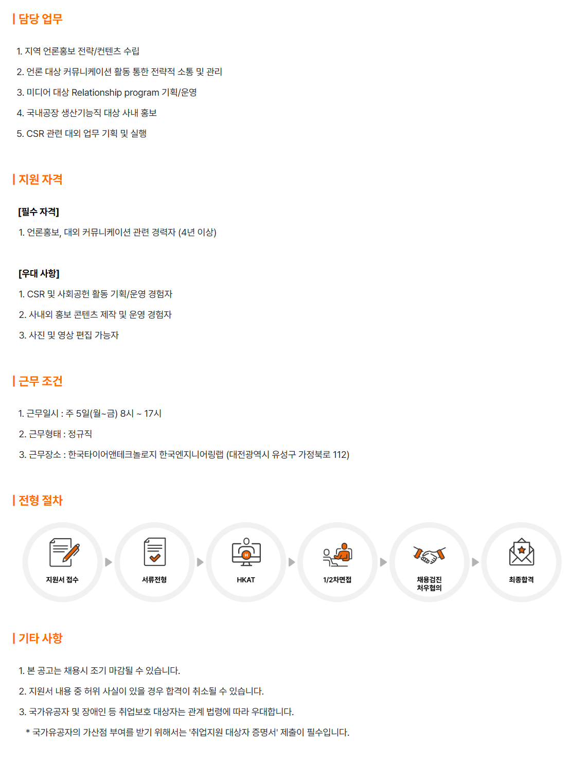 [°æ·Â] È«º¸_È«º¸/CSR | ´ã´ç ¾÷¹« 1. Áö¿ª ¾ð·ÐÈ«º¸ Àü·«/ÄÁÅÙÃ÷ ¼ö¸³ 2. ¾ð·Ð ´ë»ó Ä¿¹Â´ÏÄÉÀÌ¼Ç È°µ¿ ÅëÇÑ Àü·«Àû ¼ÒÅë ¹× °ü¸® 3. ¹Ìµð¾î ´ë»ó Relationship program ±âȹ/¿î¿µ 4. ±¹³»°øÀå »ý»ê±â´ÉÁ÷ ´ë»ó »ç³» È«º¸ 5. CSR °ü·Ã ´ë¿Ü ¾÷¹« ±âȹ ¹× ½ÇÇà | Áö¿ø ÀÚ°Ý [Çʼö ÀÚ°Ý] 1. ¾ð·ÐÈ«º¸, ´ë¿Ü Ä¿¹Â´ÏÄÉÀÌ¼Ç °ü·Ã °æ·ÂÀÚ (4³â ÀÌ»ó) [¿ì´ë »çÇ×] 1. CSR ¹× »çȸ°øÇå Ȱµ¿ ±âȹ/¿î¿µ °æÇèÀÚ 2. »ç³»¿Ü È«º¸ ÄÜÅÙÃ÷ Á¦ÀÛ ¹× ¿î¿µ °æÇèÀÚ 3. »çÁø ¹× ¿µ»ó ÆíÁý °¡´ÉÀÚ | ±Ù¹« Á¶°Ç 1. ±Ù¹«ÀϽà : ÁÖ 5ÀÏ(¿ù~±Ý) 8½Ã ~ 17½Ã 2. ±Ù¹«ÇüÅ : Á¤±ÔÁ÷ 3. ±Ù¹«Àå¼Ò : Çѱ¹Å¸ÀÌ¾î¾ØÅ×Å©³î·ÎÁö Çѱ¹¿£Áö´Ï¾î¸µ·¦ (´ëÀü±¤¿ª½Ã À¯¼º±¸ °¡Á¤ºÏ·Î 112)