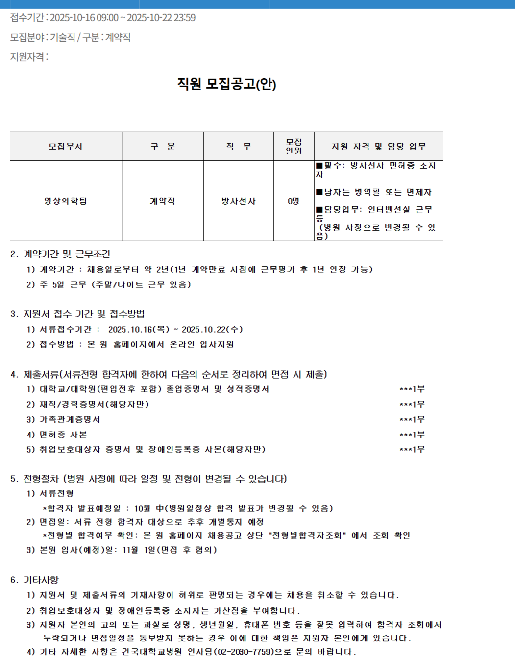¿µ»óÀÇÇÐÆÀ °è¾àÁ÷ ¹æ»ç¼±»ç 0¸í ¡áÇʼö: ¹æ»ç¼±»ç ¸éÇãÁõ ¼ÒÁöÀÚ