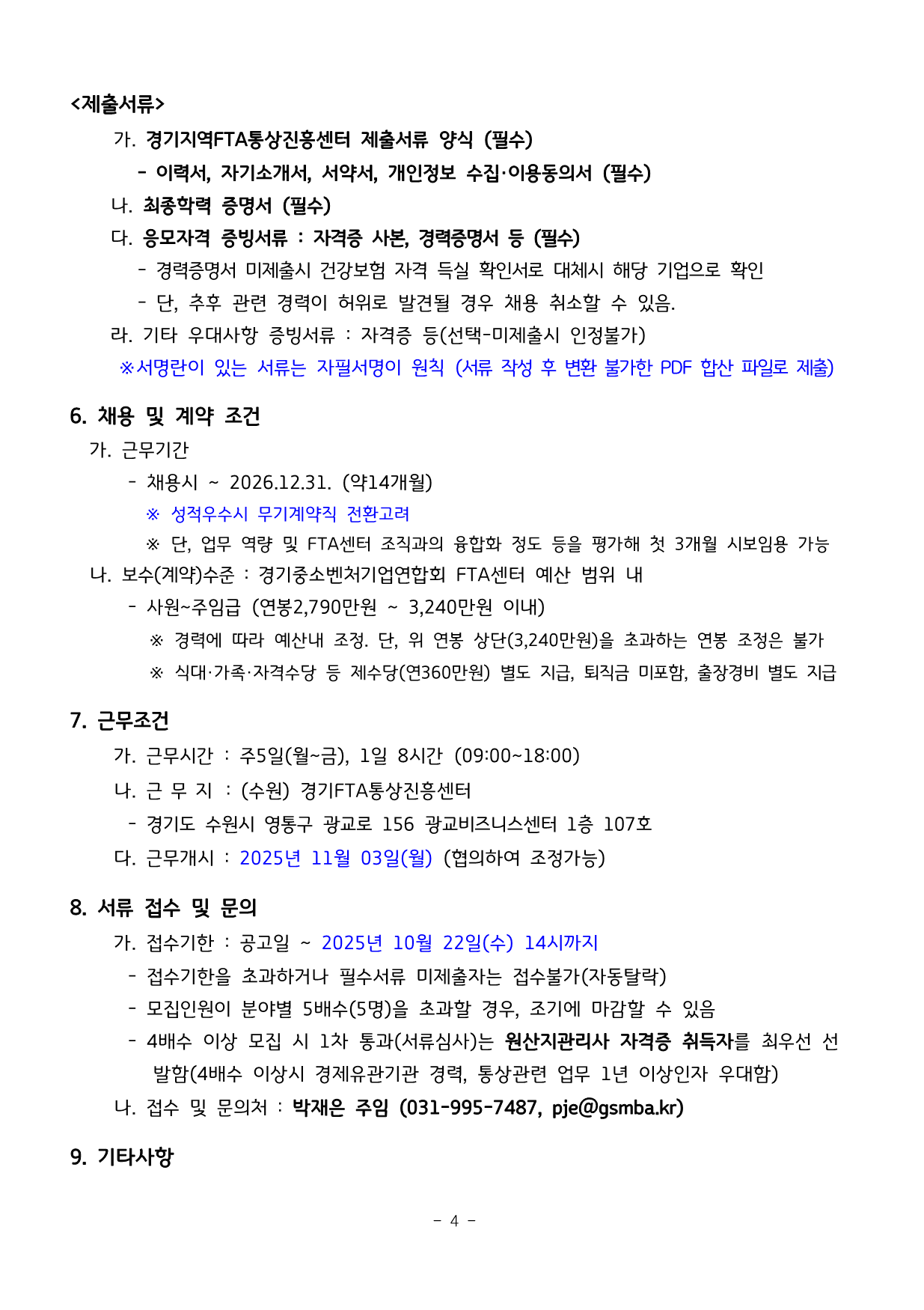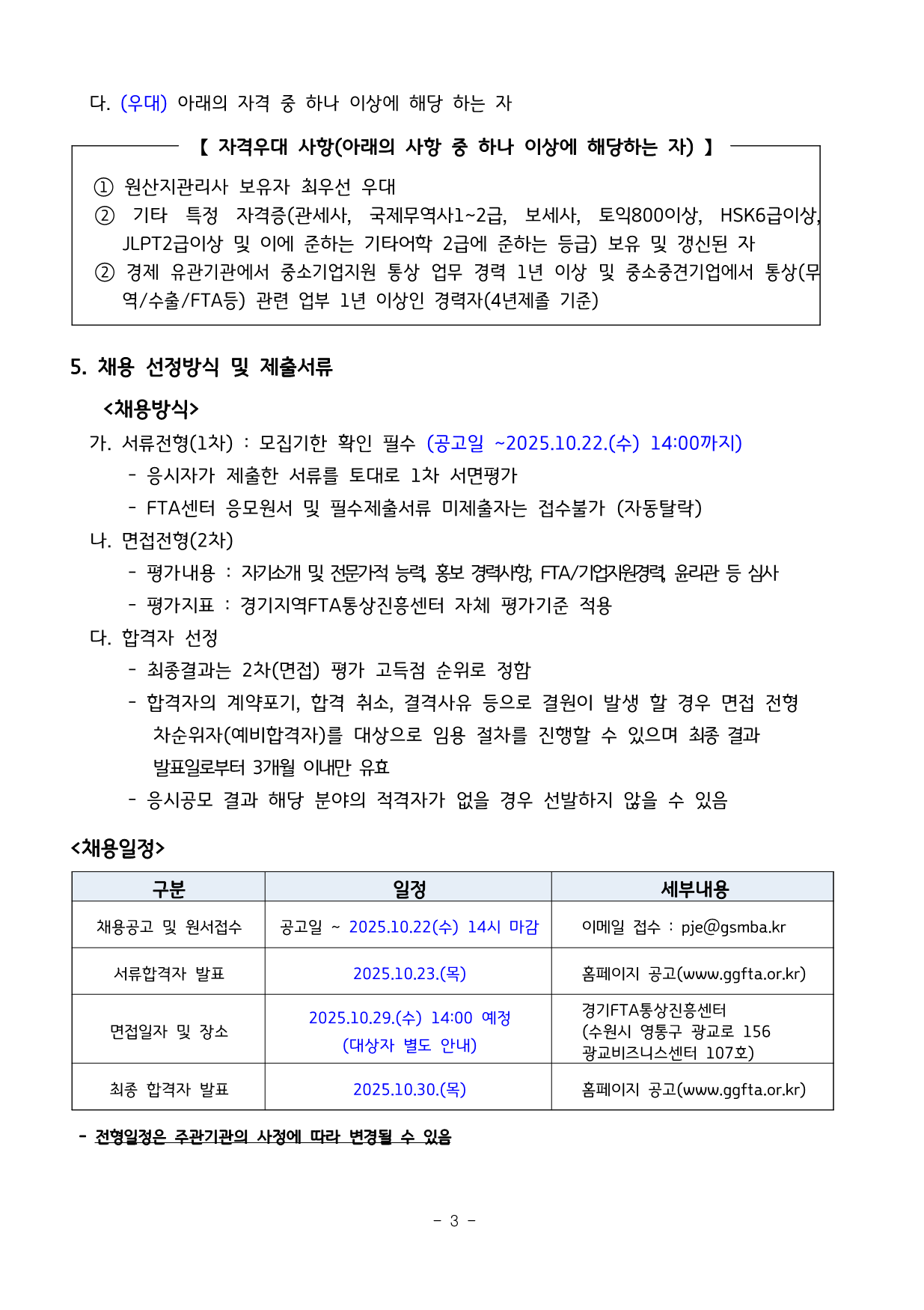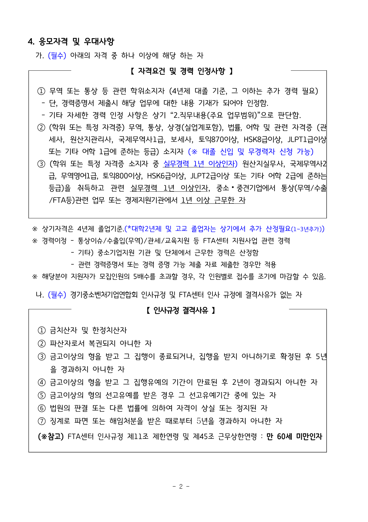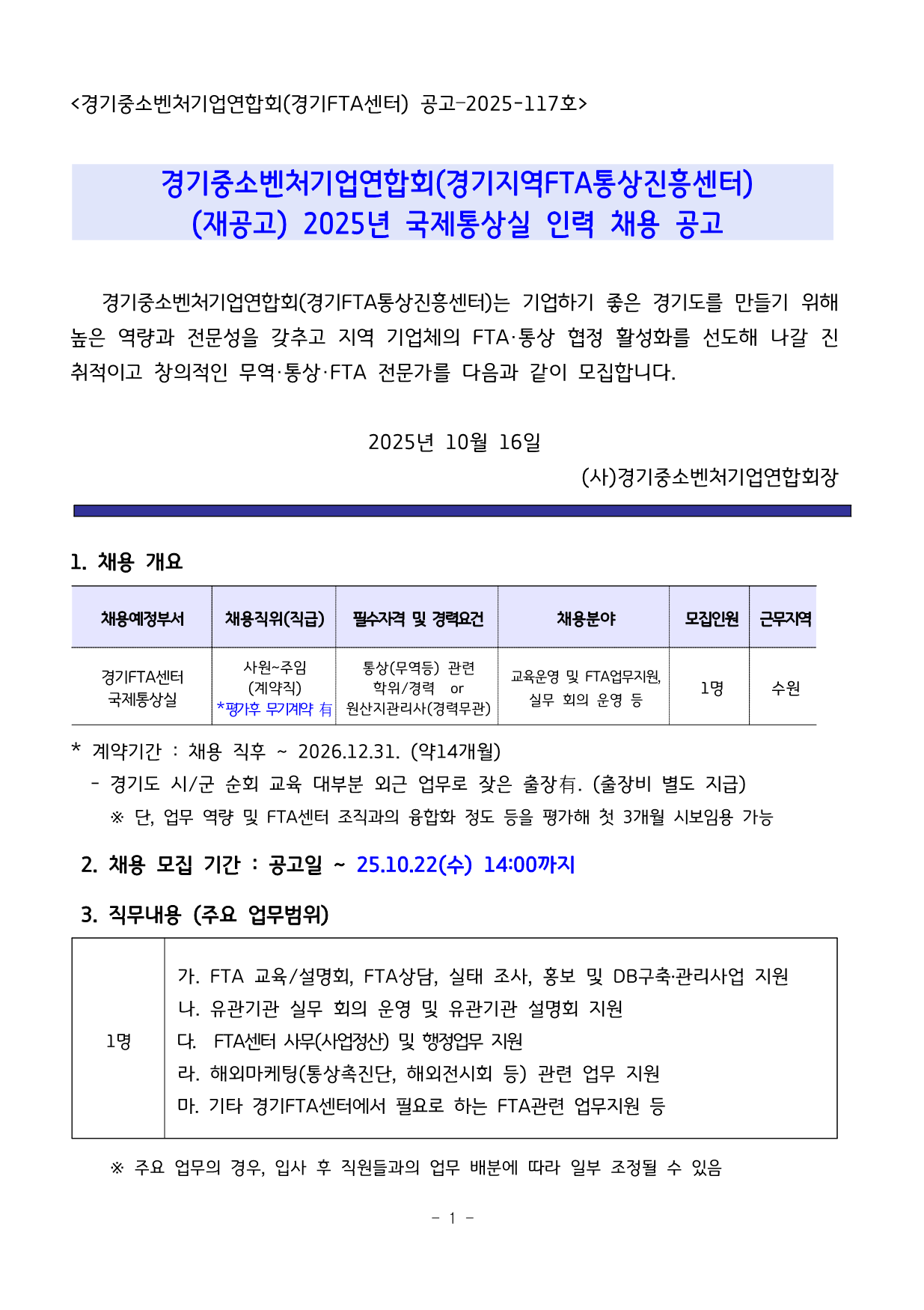 <°æ±âÁß¼Òº¥Ã³±â¾÷¿¬ÇÕȸ(°æ±âFTA¼¾ÅÍ) °ø°í–2025-117È£> °æ±âÁß¼Òº¥Ã³±â¾÷¿¬ÇÕȸ(°æ±âÁö¿ªFTAÅë»óÁøÈï¼¾ÅÍ) (Àç°ø°í) 2025³â ±¹Á¦Åë»ó½Ç Àη ä¿ë °ø°í °æ±âÁß¼Òº¥Ã³±â¾÷¿¬ÇÕȸ(°æ±âFTAÅë»óÁøÈï¼¾ÅÍ)´Â ±â¾÷Çϱâ ÁÁÀº °æ±âµµ¸¦ ¸¸µé±â À§ÇØ ³ôÀº ¿ª·®°ú Àü¹®¼ºÀ» °®Ãß°í Áö¿ª ±â¾÷üÀÇ FTA¡¤Åë»ó ÇùÁ¤ Ȱ¼ºÈ¸¦ ¼±µµÇØ ³ª°¥ ÁøÃëÀûÀ̰í âÀÇÀûÀÎ ¹«¿ª¡¤Åë»ó¡¤FTA Àü¹®°¡¸¦ ´ÙÀ½°ú °°ÀÌ ¸ðÁýÇÕ´Ï´Ù. 2025³â 10¿ù 16ÀÏ (»ç)°æ±âÁß¼Òº¥Ã³±â¾÷¿¬ÇÕȸÀå1. ä¿ë °³¿ä ä¿ë¿¹Á¤ºÎ¼ ä¿ëÁ÷À§(Á÷±Þ) ÇʼöÀÚ°Ý ¹× °æ·Â¿ä°Ç ä¿ëºÐ¾ß ¸ðÁýÀοø ±Ù¹«Áö¿ª °æ±âFTA¼¾ÅÍ ±¹Á¦Åë»ó½Ç »ç¿ø~ÁÖÀÓ (°è¾àÁ÷) *Æò°¡ÈÄ ¹«±â°è¾à êó Åë»ó(¹«¿ªµî) °ü·Ã ÇÐÀ§/°æ·Â or ¿ø»êÁö°ü¸®»ç(°æ·Â¹«°ü) ±³À°¿î¿µ ¹× FTA¾÷¹«Áö¿ø, ½Ç¹« ȸÀÇ ¿î¿µ µî 1¸í ¼ö¿ø * °è¾à±â°£ : ä¿ë Á÷ÈÄ ~ 2026.12.31. (¾à14°³¿ù) - °æ±âµµ ½Ã/±º ¼øÈ¸ ±³À° ´ëºÎºÐ ¿Ü±Ù ¾÷¹«·Î ÀæÀº ÃâÀåêó. (ÃâÀåºñ º°µµ Áö±Þ) ¡Ø ´Ü, ¾÷¹« ¿ª·® ¹× FTA¼¾ÅÍ Á¶Á÷°úÀÇ À¶ÇÕÈ Á¤µµ µîÀ» Æò°¡ÇØ Ã¹ 3°³¿ù ½Ãº¸ÀÓ¿ë °¡´É 2. ä¿ë ¸ðÁý ±â°£ : °ø°íÀÏ ~ 25.10.22(¼ö) 14:00±îÁö 3. Á÷¹«³»¿ë (ÁÖ¿ä ¾÷¹«¹üÀ§) 1¸í °¡. FTA ±³À°/¼³¸íȸ, FTA»ó´ã, ½ÇÅ Á¶»ç, È«º¸ ¹× DB±¸Ãà․°ü¸®»ç¾÷ Áö¿ø ³ª. À¯°ü±â°ü ½Ç¹« ȸÀÇ ¿î¿µ ¹× À¯°ü±â°ü ¼³¸íȸ Áö¿ø ´Ù. FTA¼¾ÅÍ »ç¹«(»ç¾÷Á¤»ê) ¹× ÇàÁ¤¾÷¹« Áö¿ø ¶ó. ÇØ¿Ü¸¶ÄÉÆÃ(Åë»óÃËÁø´Ü, ÇØ¿ÜÀü½Ãȸ µî) °ü·Ã ¾÷¹« Áö¿ø ¸¶. ±âŸ °æ±âFTA¼¾ÅÍ¿¡¼ ÇÊ¿ä·Î ÇÏ´Â FTA°ü·Ã ¾÷¹«Áö¿ø µî ¡Ø ÁÖ¿ä ¾÷¹«ÀÇ °æ¿ì, ÀÔ»ç ÈÄ Á÷¿øµé°úÀÇ ¾÷¹« ¹èºÐ¿¡ µû¶ó ÀϺΠÁ¶Á¤µÉ ¼ö ÀÖÀ½
