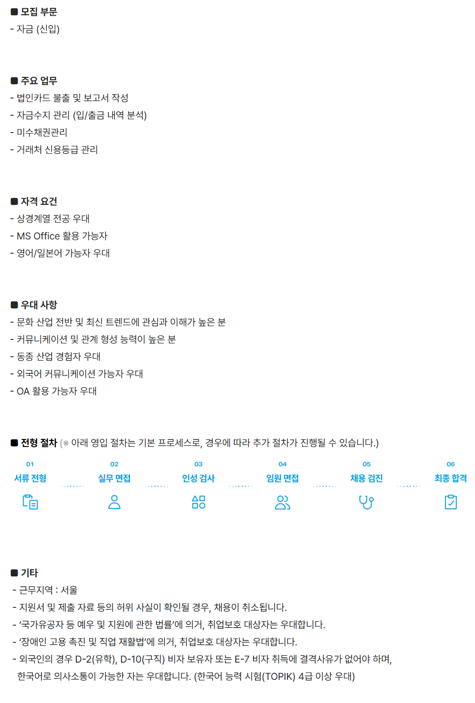 [JYP ENTERTAINMENT] ÀÚ±Ý (½ÅÀÔ) ¡á ¸ðÁý ​ºÎ¹® - ÀÚ±Ý ​(½ÅÀÔ) ¡á ​ÁÖ¿ä ¾÷¹« - ¹ýÀÎÄ«µå ​ºÒÃâ ¹× º¸°í¼­ ÀÛ¼º - ​ÀڱݼöÁö ​°ü¸® (ÀÔ/Ãâ±Ý ​³»¿ª ºÐ¼®) - ¹Ì¼öä±Ç°ü¸® - ​°Å·¡Ã³ ½Å¿ëµî±Þ ​°ü¸® ¡á ​ÀÚ°Ý ¿ä°Ç - »ó°æ°è¿­ ​Àü°ø ​¿ì´ë - ​MS Office Ȱ¿ë ​°¡´ÉÀÚ - ​¿µ¾î/ÀϺ»¾î °¡´ÉÀÚ ¿ì´ë ¡á ​¿ì´ë ​»çÇ× - ​¹®È­ »ê¾÷ Àü¹Ý ​¹× ÃֽŠ​Æ®·»µå¿¡ ​°ü½É°ú ÀÌÇØ°¡ ​³ôÀº ºÐ - ​Ä¿¹Â´ÏÄÉÀÌ¼Ç ​¹× °ü°è Çü¼º ​´É·ÂÀÌ ³ôÀº ​ºÐ - µ¿Á¾ »ê¾÷ °æÇèÀÚ ¿ì´ë - ¿Ü±¹¾î Ä¿¹Â´ÏÄÉÀÌ¼Ç °¡´ÉÀÚ ¿ì´ë - OA Ȱ¿ë °¡´ÉÀÚ ¿ì´ë