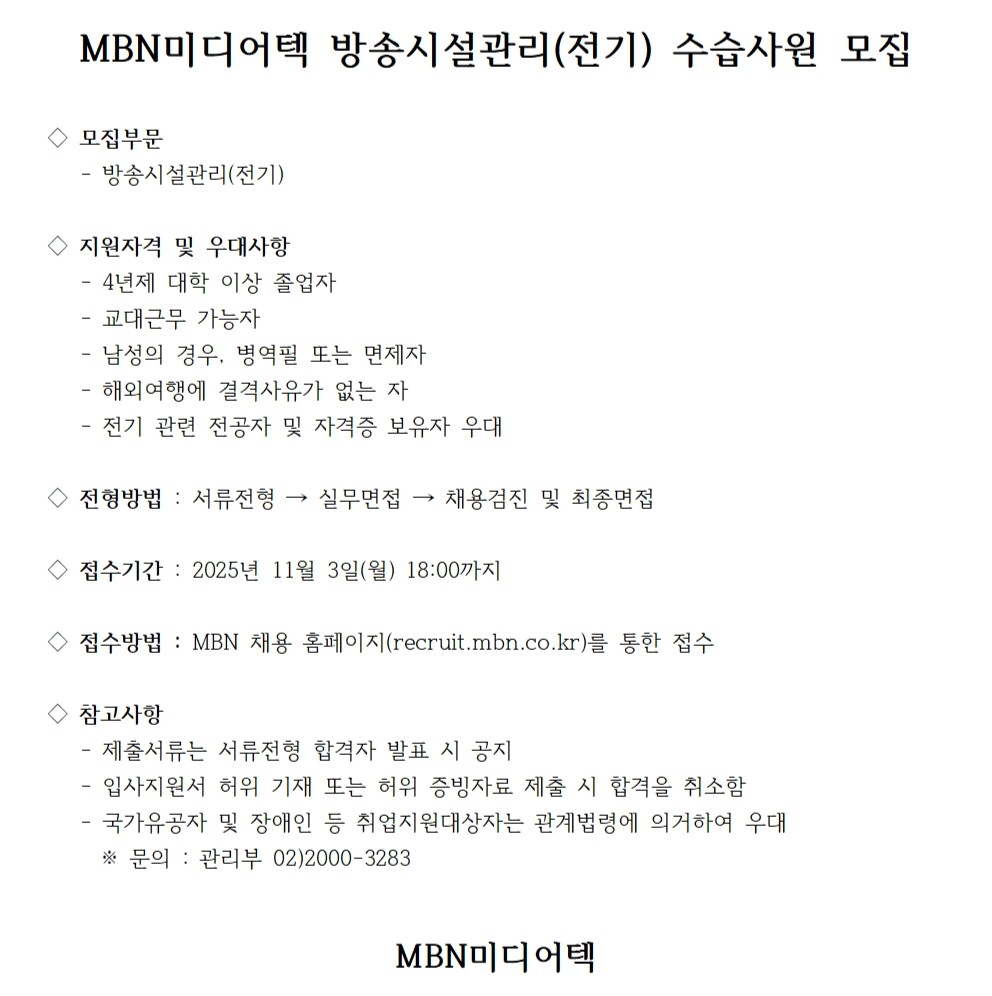 MBN¹Ìµð¾îÅØ ¹æ¼Û½Ã¼³°ü¸®(Àü±â) ¼ö½À»ç¿ø ¸ðÁý