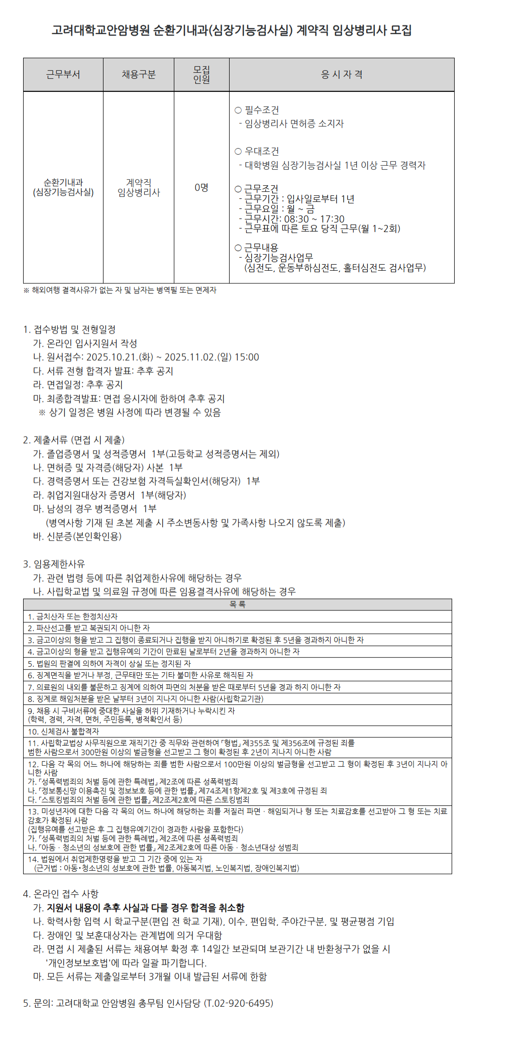 [¾È¾Ïº´¿ø 25-185]¼øÈ¯±â³»°ú(½ÉÀå±â´É°Ë»ç½Ç) °è¾àÁ÷ ÀÓ»óº´¸®»ç ¸ðÁý