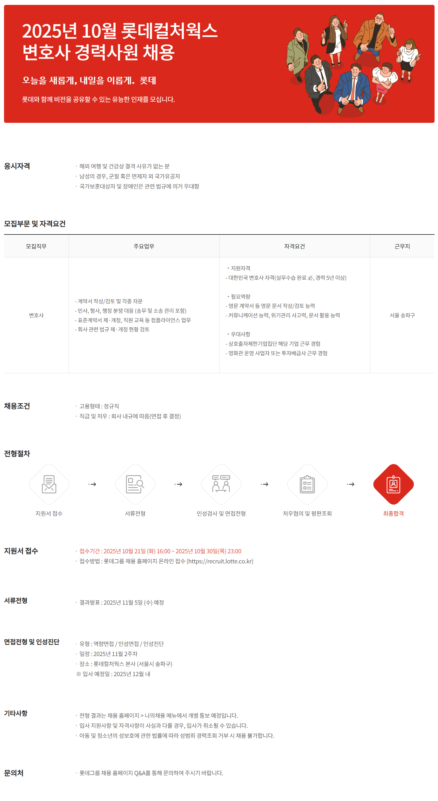 2025³â 10¿ù ·Ôµ¥ÄÃó¿÷½º º¯È£»ç °æ·Â»ç¿ø ä¿ë ¿À´ÃÀ» »õ·Ó°Ô, ³»ÀÏÀ» ÀÌ·Ó°Ô. ·Ôµ¥ ·Ôµ¥¿Í ÇÔ²² ºñÀüÀ» °øÀ¯ÇÒ ¼ö ÀÖ´Â À¯´ÉÇÑ ÀÎÀ縦 ¸ð½Ê´Ï´Ù. ÀÀ½ÃÀÚ°Ý ÇØ¿Ü ¿©Çà ¹× °Ç°­»ó °á°Ý »çÀ¯°¡ ¾ø´Â ºÐ ³²¼ºÀÇ °æ¿ì, ±ºÇÊ È¤Àº ¸éÁ¦ÀÚ ¿Ü ±¹°¡À¯°øÀÚ ±¹°¡º¸ÈÆ´ë»óÀÚ ¹× Àå¾ÖÀÎÀº °ü·Ã ¹ý±Ô¿¡ ÀǰŠ¿ì´ëÇÔ ¸ðÁýºÎ¹® ¹× ÀÚ°Ý¿ä°Ç ¸ðÁýȸ»ç, ÁÖ¿ä¾÷¹«, ÀÚ°Ý¿ä°Ç, ±Ù¹«Áö·Î ±¸¼º µÈ Ç¥ ¸ðÁýÁ÷¹« ÁÖ¿ä¾÷¹« ÀÚ°Ý¿ä°Ç ±Ù¹«Áö º¯È£»ç - °è¾à¼­ ÀÛ¼º/°ËÅä ¹× °¢Á¾ ÀÚ¹® - ¹Î»ç, Çü»ç, ÇàÁ¤ ºÐÀï ´ëÀÀ (¼Û¹« ¹× ¼Ò¼Û °ü¸® Æ÷ÇÔ) - Ç¥Áذè¾à¼­ Á¦¡¤°³Á¤, Á÷¿ø ±³À° µî ÄÄÇöóÀ̾𽺠¾÷¹« - ȸ»ç °ü·Ã ¹ý±Ô Á¦¡¤°³Á¤ ÇöȲ °ËÅä ¤ýÁö¿øÀÚ°Ý - ´ëÇѹα¹ º¯È£»ç ÀÚ°Ý(½Ç¹«¼ö½À ¿Ï·á ù±, °æ·Â 5³â ÀÌ»ó) ¤ýÇʿ俪·® - ¿µ¹® °è¾à¼­ µî ¿µ¹® ¹®¼­ ÀÛ¼º/°ËÅä ´É·Â - Ä¿¹Â´ÏÄÉÀÌ¼Ç ´É·Â, À§±â°ü¸® »ç°í·Â, ¹®¼­ Ȱ¿ë ´É·Â ¤ý¿ì´ë»çÇ× - »óÈ£ÃâÀÚÁ¦Çѱâ¾÷Áý´Ü ÇØ´ç ±â¾÷ ±Ù¹« °æÇè - ¿µÈ­°ü ¿î¿µ »ç¾÷ÀÚ ¶Ç´Â ÅõÀÚ¹è±Þ»ç ±Ù¹« °æÇè ¼­¿ï ¼ÛÆÄ±¸ ä¿ëÁ¶°Ç °í¿ëÇüÅ : Á¤±ÔÁ÷ Á÷±Þ ¹× ó¿ì : ȸ»ç ³»±Ô¿¡ µû¸§(¸éÁ¢ ÈÄ °áÁ¤)