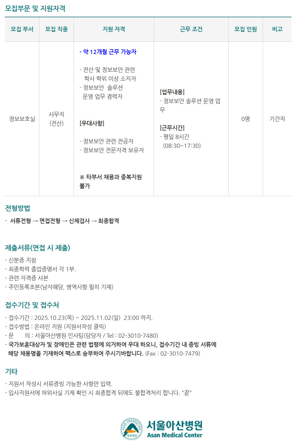 ¸ðÁýºÎ¹® ¹× Áö¿øÀÚ°Ý ¸ðÁý ºÎ¼­ ¸ðÁý Á÷Á¾ Áö¿ø ÀÚ°Ý ±Ù¹« Á¶°Ç ¸ðÁý Àοø ºñ°í Á¤º¸º¸È£½Ç »ç¹«Á÷ (Àü»ê) - ¾à 12°³¿ù ±Ù¹« °¡´ÉÀÚ - Àü»ê ¹× Á¤º¸º¸¾È °ü·Ã Çлç ÇÐÀ§ ÀÌ»ó ¼ÒÁöÀÚ - Á¤º¸º¸¾È ¼Ö·ç¼Ç ¿î¿µ ¾÷¹« °æ·ÂÀÚ [¿ì´ë»çÇ×] - Á¤º¸º¸¾È °ü·Ã Àü°øÀÚ - Á¤º¸º¸¾È Àü¹®ÀÚ°Ý º¸À¯ÀÚ ¡Ø ŸºÎ¼­ ä¿ë°ú Áߺ¹Áö¿ø ºÒ°¡ [¾÷¹«³»¿ë] - Á¤º¸º¸¾È ¼Ö·ç¼Ç ¿î¿µ ¾÷¹« [±Ù¹«½Ã°£] - ÆòÀÏ 8½Ã°£ (08:30~17:30) 0¸í ±â°£Á÷ ÀüÇü¹æ¹ý - ¼­·ùÀüÇü ¡æ ¸éÁ¢ÀüÇü ¡æ ½Åü°Ë»ç ¡æ ÃÖÁ¾ÇÕ°Ý Á¦Ãâ¼­·ù(¸éÁ¢ ½Ã Á¦Ãâ) - ½ÅºÐÁõ ÁöÂü - ÃÖÁ¾Çз Á¹¾÷Áõ¸í¼­ °¢ 1ºÎ. - °ü·Ã ÀÚ°ÝÁõ »çº» - Áֹεî·ÏÃʺ»(³²ÀÚÇØ´ç, º´¿ª»çÇ× ÇÊÈ÷ ±âÀç) Á¢¼ö±â°£ ¹× Á¢¼öó - Á¢¼ö±â°£ : 2025.10.23(¸ñ) ~ 2025.11.02(ÀÏ) 23:00 ±îÁö. - Á¢¼ö¹æ¹ý : ¿Â¶óÀÎ Áö¿ø (Áö¿ø¼­ÀÛ¼º Ŭ¸¯) - ¹® ÀÇ : ¼­¿ï¾Æ»êº´¿ø ÀλçÆÀ(´ã´çÀÚ / Tel : ***-****-****) - ±¹°¡º¸ÈÆ´ë»óÀÚ ¹× Àå¾ÖÀÎÀº °ü·Ã ¹ý·É¿¡ ÀǰÅÇÏ¿© ¿ì´ë ÇÏ¿À´Ï, Á¢¼ö±â°£ ³» Áõºù ¼­·ù¿¡ ÇØ´ç ä¿ë¸íÀ» ±âÀçÇÏ¿© ÆÑ½º·Î ¼ÛºÎÇÏ¿© Áֽñâ¹Ù¶ø´Ï´Ù. (Fax : ***-****-****) ±âŸ - Áö¿ø¼­ ÀÛ¼º½Ã ¼­·ùÁõºù °¡´ÉÇÑ »çÇ׸¸ ÀÔ·Â. - ÀÔ»çÁö¿ø¼­¿¡ ÇãÀ§»ç½Ç ±âÀç È®ÀÎ ½Ã ÃÖÁ¾ÇÕ°Ý µÚ¿¡µµ ºÒÇÕ°Ýó¸® ÇÕ´Ï´Ù. "³¡"