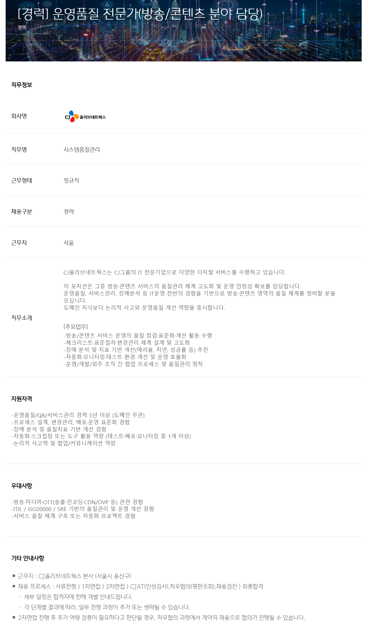 ◼ ±Ù¹«Áö : CJ¿Ã¸®ºê³×Æ®¿÷½º º»»ç (¼¿ï½Ã ¿ë»ê±¸)