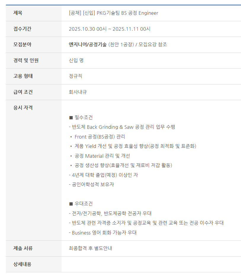 Á¦¸ñ	[°øÃ¤] [½ÅÀÔ] PKG±â¼úÆÀ BS °øÁ¤ Engineer