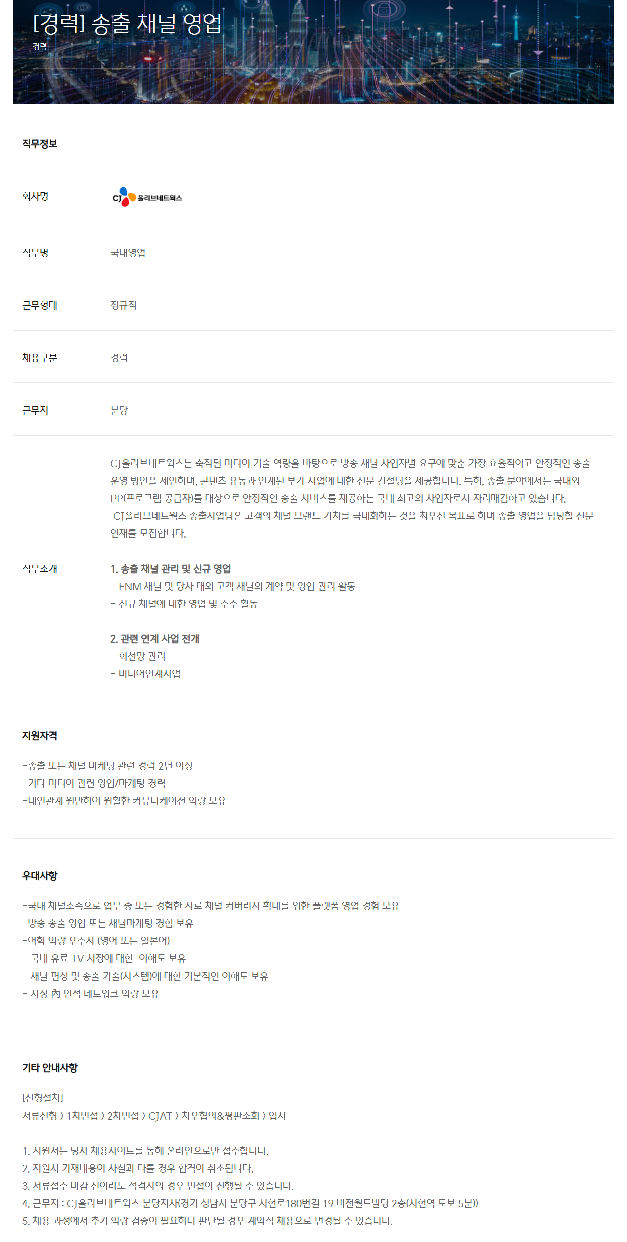 CJ¿Ã¸®ºê³×Æ®¿÷½º´Â ÃàÀûµÈ ¹Ìµð¾î ±â¼ú ¿ª·®À» ¹ÙÅÁÀ¸·Î ¹æ¼Û ä³Î »ç¾÷ÀÚº° ¿ä±¸¿¡ ¸ÂÃá °¡Àå È¿À²ÀûÀÌ°í ¾ÈÁ¤ÀûÀÎ ¼ÛÃ⠿ ¹æ¾ÈÀ» Á¦¾ÈÇϸç, ÄÜÅÙÃ÷ À¯Åë°ú ¿¬°èµÈ ºÎ°¡ »ç¾÷¿¡ ´ëÇÑ Àü¹® ÄÁ¼³ÆÃÀ» Á¦°øÇÕ´Ï´Ù. ƯÈ÷, ¼ÛÃ⠺о߿¡¼´Â ±¹³»¿Ü PP(ÇÁ·Î±×·¥ °ø±ÞÀÚ)¸¦ ´ë»óÀ¸·Î ¾ÈÁ¤ÀûÀÎ ¼ÛÃâ ¼ºñ½º¸¦ Á¦°øÇÏ´Â ±¹³» ÃÖ°íÀÇ »ç¾÷Àڷμ ÀÚ¸®¸Å±èÇϰí ÀÖ½À´Ï´Ù.  CJ¿Ã¸®ºê³×Æ®¿÷½º ¼ÛÃâ»ç¾÷ÆÀÀº °í°´ÀÇ Ã¤³Î ºê·£µå °¡Ä¡¸¦ ±Ø´ëÈÇÏ´Â °ÍÀ» ÃÖ¿ì¼± ¸ñÇ¥·Î ÇÏ¸ç ¼ÛÃâ ¿µ¾÷À» ´ã´çÇÒ Àü¹® ÀÎÀ縦 ¸ðÁýÇÕ´Ï´Ù.