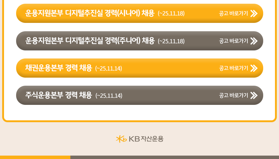 KBÀÚ»ê¿î¿ë(ÁÖ)¿¡¼­ ÇÔ²² ±Ù¹«ÇÒ ÀÎÀ縦 ã½À´Ï´Ù KBÀÚ»ê¿î¿ë(ÁÖ)¿¡¼­ ÇÔ²² ¼ºÀåÇÒ ÀÎÀ縦 ¸ðÁýÇÏ¿À´Ï ¸¹Àº °ü½É°ú Áö¿ø ¹Ù¶ø´Ï´Ù. ¿î¿ëÁö¿øº»ºÎ µðÁöÅÐÃßÁø½Ç °æ·Â(ÁִϾî) ä¿ë https://kbam.careerlink.kr/jobs/RC2***-****-****722 ä±Ç¿î¿ëº»ºÎ °æ·Â ä¿ë https://kbam.careerlink.kr/jobs/RC2***-****-****358 ÁֽĿî¿ëº»ºÎ °æ·Â ä¿ë https://kbam.careerlink.kr/jobs/RC2***-****-****333 ¿î¿ëÁö¿øº»ºÎ µðÁöÅÐÃßÁø½Ç °æ·Â(½Ã´Ï¾î) ä¿ë https://kbam.careerlink.kr/jobs/RC2***-****-****203