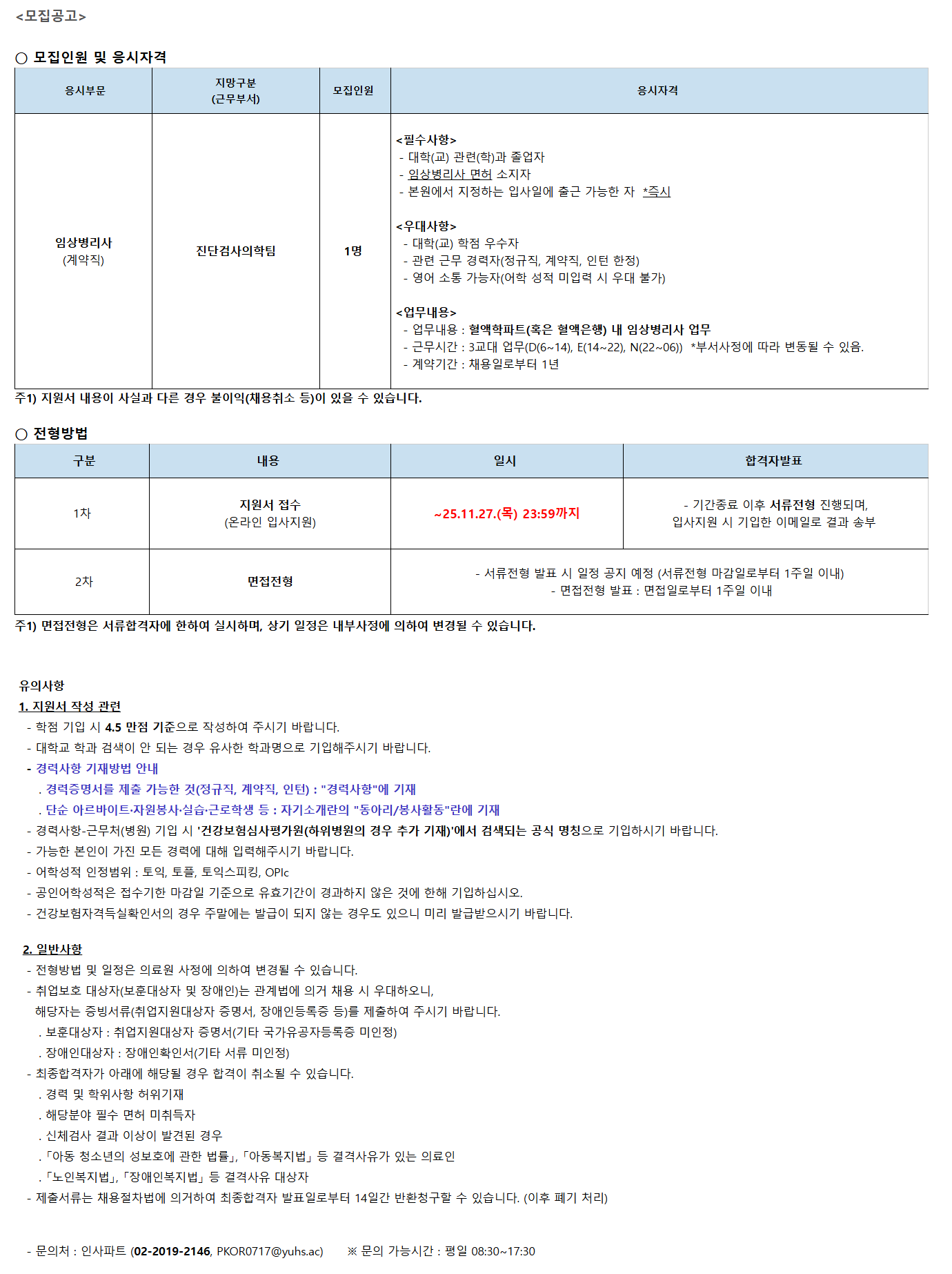 <¸ðÁý°ø°í> ¡Û ¸ðÁýÀοø ¹× ÀÀ½ÃÀÚ°Ý ÀÀ½ÃºÎ¹® Áö¸Á±¸ºÐ (±Ù¹«ºÎ¼­) ¸ðÁýÀοø ÀÀ½ÃÀÚ°Ý ÀÓ»óº´¸®»ç (°è¾àÁ÷) Áø´Ü°Ë»çÀÇÇÐÆÀ 1¸í <Çʼö»çÇ×> - ´ëÇÐ(±³) °ü·Ã(ÇÐ)°ú Á¹¾÷ÀÚ - ÀÓ»óº´¸®»ç ¸éÇã ¼ÒÁöÀÚ - º»¿ø¿¡¼­ ÁöÁ¤ÇÏ´Â ÀÔ»çÀÏ¿¡ Ãâ±Ù °¡´ÉÇÑ ÀÚ *Áï½Ã <¿ì´ë»çÇ×> - ´ëÇÐ(±³) ÇÐÁ¡ ¿ì¼öÀÚ - °ü·Ã ±Ù¹« °æ·ÂÀÚ(Á¤±ÔÁ÷, °è¾àÁ÷, ÀÎÅÏ ÇÑÁ¤) - ¿µ¾î ¼ÒÅë °¡´ÉÀÚ(¾îÇÐ ¼ºÀû ¹ÌÀÔ·Â ½Ã ¿ì´ë ºÒ°¡) <¾÷¹«³»¿ë> - ¾÷¹«³»¿ë : Ç÷¾×ÇÐÆÄÆ®(ȤÀº Ç÷¾×ÀºÇà) ³» ÀÓ»óº´¸®»ç ¾÷¹« - ±Ù¹«½Ã°£ : 3±³´ë ¾÷¹«(D(6~14), E(14~22), N(22~06)) *ºÎ¼­»çÁ¤¿¡ µû¶ó º¯µ¿µÉ ¼ö ÀÖÀ½. - °è¾à±â°£ : ä¿ëÀϷκÎÅÍ 1³â ÁÖ1) Áö¿ø¼­ ³»¿ëÀÌ »ç½Ç°ú ´Ù¸¥ °æ¿ì ºÒÀÌÀÍ(ä¿ëÃë¼Ò µî)ÀÌ ÀÖÀ» ¼ö ÀÖ½À´Ï´Ù. ¡Û ÀüÇü¹æ¹ý ±¸ºÐ ³»¿ë ÀϽà ÇÕ°ÝÀÚ¹ßÇ¥ 1Â÷ Áö¿ø¼­ Á¢¼ö (¿Â¶óÀÎ ÀÔ»çÁö¿ø) ~25.11.27.(¸ñ) 23:59±îÁö - ±â°£Á¾·á ÀÌÈÄ ¼­·ùÀüÇü ÁøÇàµÇ¸ç, ÀÔ»çÁö¿ø ½Ã ±âÀÔÇÑ À̸ÞÀÏ·Î °á°ú ¼ÛºÎ 2Â÷ ¸éÁ¢ÀüÇü - ¼­·ùÀüÇü ¹ßÇ¥ ½Ã ÀÏÁ¤ °øÁö ¿¹Á¤ (¼­·ùÀüÇü ¸¶°¨ÀϷκÎÅÍ 1ÁÖÀÏ À̳») - ¸éÁ¢ÀüÇü ¹ßÇ¥ : ¸éÁ¢ÀϷκÎÅÍ 1ÁÖÀÏ À̳» ÁÖ1) ¸éÁ¢ÀüÇüÀº ¼­·ùÇÕ°ÝÀÚ¿¡ ÇÑÇÏ¿© ½Ç½ÃÇϸç, »ó±â ÀÏÁ¤Àº ³»ºÎ»çÁ¤¿¡ ÀÇÇÏ¿© º¯°æµÉ ¼ö ÀÖ½À´Ï´Ù. À¯ÀÇ»çÇ× 1. Áö¿ø¼­ ÀÛ¼º °ü·Ã - ÇÐÁ¡ ±âÀÔ ½Ã 4.5 ¸¸Á¡ ±âÁØÀ¸·Î ÀÛ¼ºÇÏ¿© Áֽñ⠹ٶø´Ï´Ù. - ´ëÇб³ Çаú °Ë»öÀÌ ¾È µÇ´Â °æ¿ì À¯»çÇÑ Çаú¸íÀ¸·Î ±âÀÔÇØÁֽñ⠹ٶø´Ï´Ù. - °æ·Â»çÇ× ±âÀç¹æ¹ý ¾È³» . °æ·ÂÁõ¸í¼­¸¦ Á¦Ãâ °¡´ÉÇÑ °Í(Á¤±ÔÁ÷, °è¾àÁ÷, ÀÎÅÏ) : "°æ·Â»çÇ×"¿¡ ±âÀç . ´Ü¼ø ¾Æ¸£¹ÙÀÌÆ®¡¤ÀÚ¿øºÀ»ç¡¤½Ç½À¡¤±Ù·ÎÇлý µî : ÀÚ±â¼Ò°³¶õÀÇ "µ¿¾Æ¸®/ºÀ»çȰµ¿"¶õ¿¡ ±âÀç - °æ·Â»çÇ×-±Ù¹«Ã³(º´¿ø) ±âÀÔ ½Ã '°Ç°­º¸Çè½É»çÆò°¡¿ø(ÇÏÀ§º´¿øÀÇ °æ¿ì Ãß°¡ ±âÀç)'¿¡¼­ °Ë»öµÇ´Â °ø½Ä ¸íĪÀ¸·Î ±âÀÔÇϽñ⠹ٶø´Ï´Ù. - °¡´ÉÇÑ º»ÀÎÀÌ °¡Áø ¸ðµç °æ·Â¿¡ ´ëÇØ ÀÔ·ÂÇØÁֽñ⠹ٶø´Ï´Ù. - ¾îÇмºÀû ÀÎÁ¤¹üÀ§ : ÅäÀÍ, ÅäÇÃ, ÅäÀͽºÇÇÅ·, OPIc - °øÀξîÇмºÀûÀº Á¢¼ö±âÇÑ ¸¶°¨ÀÏ ±âÁØÀ¸·Î À¯È¿±â°£ÀÌ °æ°úÇÏÁö ¾ÊÀº °Í¿¡ ÇÑÇØ ±âÀÔÇϽʽÿÀ. - °Ç°­º¸ÇèÀڰݵæ½ÇÈ®Àμ­ÀÇ °æ¿ì ÁÖ¸»¿¡´Â ¹ß±ÞÀÌ µÇÁö ¾Ê´Â °æ¿ìµµ ÀÖÀ¸´Ï ¹Ì¸® ¹ß±Þ¹ÞÀ¸½Ã±â ¹Ù¶ø´Ï´Ù. 2. ÀϹݻçÇ× - ÀüÇü¹æ¹ý ¹× ÀÏÁ¤Àº ÀÇ·á¿ø »çÁ¤¿¡ ÀÇÇÏ¿© º¯°æµÉ ¼ö ÀÖ½À´Ï´Ù. - Ãë¾÷º¸È£ ´ë»óÀÚ(º¸ÈÆ´ë»óÀÚ ¹× Àå¾ÖÀÎ)´Â °ü°è¹ý¿¡ ÀǰŠä¿ë ½Ã ¿ì´ëÇÏ¿À´Ï, ÇØ´çÀÚ´Â Áõºù¼­·ù(Ãë¾÷Áö¿ø´ë»óÀÚ Áõ¸í¼­, Àå¾ÖÀεî·ÏÁõ µî)¸¦ Á¦ÃâÇÏ¿© Áֽñ⠹ٶø´Ï´Ù. . º¸ÈÆ´ë»óÀÚ : Ãë¾÷Áö¿ø´ë»óÀÚ Áõ¸í¼­(±âŸ ±¹°¡À¯°øÀÚµî·ÏÁõ ¹ÌÀÎÁ¤) . Àå¾ÖÀδë»óÀÚ : Àå¾ÖÀÎÈ®Àμ­(±âŸ ¼­·ù ¹ÌÀÎÁ¤) - ÃÖÁ¾ÇÕ°ÝÀÚ°¡ ¾Æ·¡¿¡ ÇØ´çµÉ °æ¿ì ÇÕ°ÝÀÌ Ãë¼ÒµÉ ¼ö ÀÖ½À´Ï´Ù. . °æ·Â ¹× ÇÐÀ§»çÇ× ÇãÀ§±âÀç . ÇØ´çºÐ¾ß Çʼö ¸éÇã ¹ÌÃëµæÀÚ . ½Åü°Ë»ç °á°ú ÀÌ»óÀÌ ¹ß°ßµÈ °æ¿ì . ¡¸¾Æµ¿ û¼Ò³âÀÇ ¼ºº¸È£¿¡ °üÇÑ ¹ý·ü¡¹, ¡¸¾Æµ¿º¹Áö¹ý¡¹ µî °á°Ý»çÀ¯°¡ ÀÖ´Â ÀÇ·áÀÎ . ¡¸³ëÀκ¹Áö¹ý¡¹, ¡¸Àå¾ÖÀκ¹Áö¹ý¡¹ µî °á°Ý»çÀ¯ ´ë»óÀÚ - Á¦Ãâ¼­·ù´Â ä¿ëÀýÂ÷¹ý¿¡ ÀǰÅÇÏ¿© ÃÖÁ¾ÇÕ°ÝÀÚ ¹ßÇ¥ÀϷκÎÅÍ 14Àϰ£ ¹Ýȯû±¸ÇÒ ¼ö ÀÖ½À´Ï´Ù. (ÀÌÈÄ Æó±â ó¸®) - ¹®ÀÇó : ÀλçÆÄÆ® (***-****-****, ******@*******.***) ¡Ø ¹®ÀÇ °¡´É½Ã°£ : ÆòÀÏ 08:30~17:30