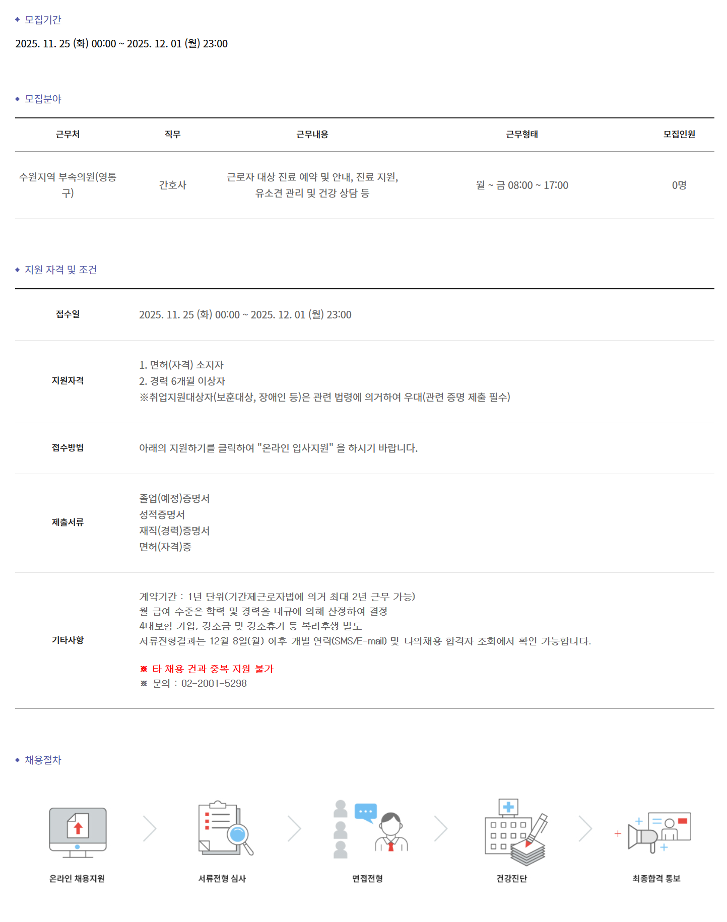 ±Ù¹«Ã³ Á÷¹« ±Ù¹«³»¿ë ±Ù¹«ÇüÅ ¸ðÁýÀοø ¼ö¿øÁö¿ª ºÎ¼ÓÀÇ¿ø(¿µÅ뱸) °£È£»ç ±Ù·ÎÀÚ ´ë»ó Áø·á ¿¹¾à ¹× ¾È³», Áø·á Áö¿ø, À¯¼Ò°ß °ü¸® ¹× °Ç° »ó´ã µî ¿ù ~ ±Ý 08:00 ~ 17:00 0¸í
