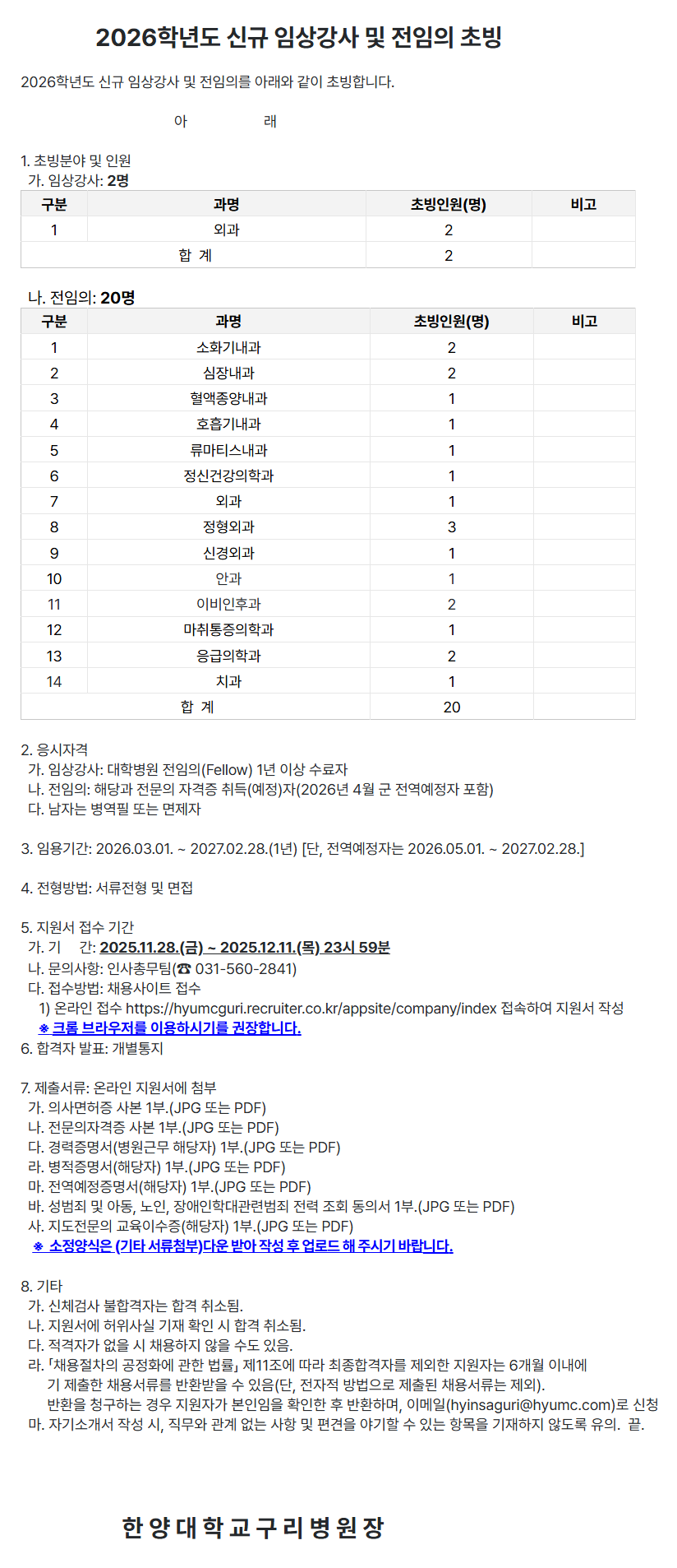 2026Çг⵵ ½Å±Ô ÀÓ»ó°­»ç ¹× ÀüÀÓÀÇ Ãʺù 2026Çг⵵ ½Å±Ô ÀÓ»ó°­»ç ¹× ÀüÀÓÀǸ¦ ¾Æ·¡¿Í °°ÀÌ ÃʺùÇÕ´Ï´Ù. ¾Æ ·¡ 1. ÃʺùºÐ¾ß ¹× Àοø °¡. ÀÓ»ó°­»ç: 2¸í ±¸ºÐ °ú¸í ÃʺùÀοø(¸í) ºñ°í 1 ¿Ü°ú 2 ÇÕ °è 2 ³ª. ÀüÀÓÀÇ: 20¸í ±¸ºÐ °ú¸í ÃʺùÀοø(¸í) ºñ°í 1 ¼ÒÈ­±â³»°ú 2 2 ½ÉÀå³»°ú 2 3 Ç÷¾×Á¾¾ç³»°ú 1 4 È£Èí±â³»°ú 1 5 ·ù¸¶Æ¼½º³»°ú 1 6 Á¤½Å°Ç°­ÀÇÇаú 1 7 ¿Ü°ú 1 8 Á¤Çü¿Ü°ú 3 9 ½Å°æ¿Ü°ú 1 10 ¾È°ú 1 11 À̺ñÀÎÈİú 2 12 ¸¶ÃëÅëÁõÀÇÇаú 1 13 ÀÀ±ÞÀÇÇаú 2 14 Ä¡°ú 1 ÇÕ °è 20 2. ÀÀ½ÃÀÚ°Ý °¡. ÀÓ»ó°­»ç: ´ëÇк´¿ø ÀüÀÓÀÇ(Fellow) 1³â ÀÌ»ó ¼ö·áÀÚ ³ª. ÀüÀÓÀÇ: ÇØ´ç°ú Àü¹®ÀÇ ÀÚ°ÝÁõ Ãëµæ(¿¹Á¤)ÀÚ(2026³â 4¿ù ±º Àü¿ª¿¹Á¤ÀÚ Æ÷ÇÔ) ´Ù. ³²ÀÚ´Â º´¿ªÇÊ ¶Ç´Â ¸éÁ¦ÀÚ 3. ÀÓ¿ë±â°£: 2026.03.01. ~ 2027.02.28.(1³â) [´Ü, Àü¿ª¿¹Á¤ÀÚ´Â 2026.05.01. ~ 2027.02.28.] 4. ÀüÇü¹æ¹ý: ¼­·ùÀüÇü ¹× ¸éÁ¢ 5. Áö¿ø¼­ Á¢¼ö ±â°£ °¡. ±â °£: 2025.11.28.(±Ý) ~ 2025.12.11.(¸ñ) 23½Ã 59ºÐ ³ª. ¹®ÀÇ»çÇ×: ÀλçÃѹ«ÆÀ(¢Ï ***-****-****) ´Ù. Á¢¼ö¹æ¹ý: ä¿ë»çÀÌÆ® Á¢¼ö 1) ¿Â¶óÀÎ Á¢¼ö https://hyumcguri.recruiter.co.kr/appsite/company/index Á¢¼ÓÇÏ¿© Áö¿ø¼­ ÀÛ¼º ¡Ø Å©·Ò ºê¶ó¿ìÀú¸¦ ÀÌ¿ëÇϽñ⸦ ±ÇÀåÇÕ´Ï´Ù. 6. ÇÕ°ÝÀÚ ¹ßÇ¥: °³º°ÅëÁö 7. Á¦Ãâ¼­·ù: ¿Â¶óÀÎ Áö¿ø¼­¿¡ ÷ºÎ °¡. ÀÇ»ç¸éÇãÁõ »çº» 1ºÎ.(JPG ¶Ç´Â PDF) ³ª. Àü¹®ÀÇÀÚ°ÝÁõ »çº» 1ºÎ.(JPG ¶Ç´Â PDF) ´Ù. °æ·ÂÁõ¸í¼­(º´¿ø±Ù¹« ÇØ´çÀÚ) 1ºÎ.(JPG ¶Ç´Â PDF) ¶ó. º´ÀûÁõ¸í¼­(ÇØ´çÀÚ) 1ºÎ.(JPG ¶Ç´Â PDF) ¸¶. Àü¿ª¿¹Á¤Áõ¸í¼­(ÇØ´çÀÚ) 1ºÎ.(JPG ¶Ç´Â PDF) ¹Ù. ¼º¹üÁË ¹× ¾Æµ¿, ³ëÀÎ, Àå¾ÖÀÎÇдë°ü·Ã¹üÁË Àü·Â Á¶È¸ µ¿ÀǼ­ 1ºÎ.(JPG ¶Ç´Â PDF) »ç. ÁöµµÀü¹®ÀÇ ±³À°À̼öÁõ(ÇØ´çÀÚ) 1ºÎ.(JPG ¶Ç´Â PDF) ¡Ø ¼ÒÁ¤¾ç½ÄÀº (±âŸ ¼­·ù÷ºÎ)´Ù¿î ¹Þ¾Æ ÀÛ¼º ÈÄ ¾÷·Îµå ÇØ Áֽñ⠹ٶø´Ï´Ù. 8. ±âŸ °¡. ½Åü°Ë»ç ºÒÇÕ°ÝÀÚ´Â ÇÕ°Ý Ãë¼ÒµÊ. ³ª. Áö¿ø¼­¿¡ ÇãÀ§»ç½Ç ±âÀç È®ÀÎ ½Ã ÇÕ°Ý Ãë¼ÒµÊ. ´Ù. Àû°ÝÀÚ°¡ ¾øÀ» ½Ã ä¿ëÇÏÁö ¾ÊÀ» ¼öµµ ÀÖÀ½. ¶ó. ¡¸Ã¤¿ëÀýÂ÷ÀÇ °øÁ¤È­¿¡ °üÇÑ ¹ý·ü¡¹ Á¦11Á¶¿¡ µû¶ó ÃÖÁ¾ÇÕ°ÝÀÚ¸¦ Á¦¿ÜÇÑ Áö¿øÀÚ´Â 6°³¿ù À̳»¿¡ ±â Á¦ÃâÇÑ Ã¤¿ë¼­·ù¸¦ ¹Ýȯ¹ÞÀ» ¼ö ÀÖÀ½(´Ü, ÀüÀÚÀû ¹æ¹ýÀ¸·Î Á¦ÃâµÈ ä¿ë¼­·ù´Â Á¦¿Ü). ¹ÝȯÀ» û±¸ÇÏ´Â °æ¿ì Áö¿øÀÚ°¡ º»ÀÎÀÓÀ» È®ÀÎÇÑ ÈÄ ¹ÝȯÇϸç, À̸ÞÀÏ(******@*******.***)·Î ½Åû ¸¶. ÀÚ±â¼Ò°³¼­ ÀÛ¼º ½Ã, Á÷¹«¿Í °ü°è ¾ø´Â »çÇ× ¹× Æí°ßÀ» ¾ß±âÇÒ ¼ö ÀÖ´Â Ç׸ñÀ» ±âÀçÇÏÁö ¾Êµµ·Ï À¯ÀÇ. ³¡. ÇÑ ¾ç ´ë ÇÐ ±³ ±¸ ¸® º´ ¿ø Àå