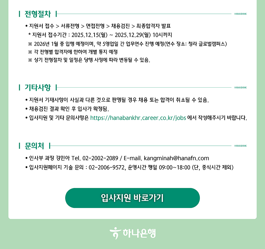 ¡Ü ÀÔ»çÁö¿ø ¹× ±âŸ ¹®ÀÇ»çÇ×Àº https://hanabankhr.career.co.kr/jpds ¿¡¼ ÀÛ¼ºÇØÁֽñ⠹ٶø´Ï´Ù.