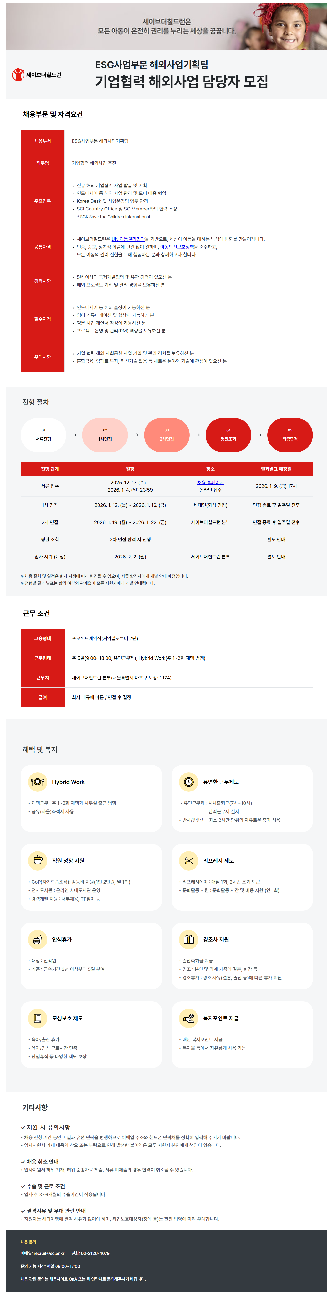 ä¿ëºÎ¹® ¹× ÀÚ°Ý¿ä°Ç ä¿ëºÎ¼­ ESG»ç¾÷ºÎ¹® ÇØ¿Ü»ç¾÷±âȹÆÀ Á÷¹«¸í ±â¾÷Çù·Â ÇØ¿Ü»ç¾÷ ÃßÁø ÁÖ¿ä¾÷¹« ½Å±Ô ÇØ¿Ü ±â¾÷Çù·Â »ç¾÷ ¹ß±¼ ¹× ±âȹ Àεµ³×½Ã¾Æ µî ÇØ¿Ü »ç¾÷ °ü¸® ¹× µµ³Ê ´ëÀÀ Çù¾÷ Korea Desk ¹× »ç¾÷¿î¿µÆÀ ¾÷¹« °ü¸® SCI Country Office ¹× SC Member¿ÍÀÇ Çù·Â¡¤Á¶Á¤ * SCI: Save the Children International °øÅëÀÚ°Ý ¼¼À̺ê´õÄ¥µå·±Àº UN ¾Æµ¿±Ç¸®Çù¾àÀ» ±â¹ÝÀ¸·Î, ¼¼»óÀÌ ¾Æµ¿À» ´ëÇÏ´Â ¹æ½Ä¿¡ º¯È­¸¦ ¸¸µé¾î°©´Ï´Ù. ÀÎÁ¾, Á¾±³, Á¤Ä¡Àû À̳信 Æí°ß ¾øÀÌ ÀÏÇϸç, ¾Æµ¿¾ÈÀüº¸È£Á¤Ã¥À» ÁؼöÇϰí, ¸ðµç ¾Æµ¿ÀÇ ±Ç¸® ½ÇÇöÀ» À§ÇØ ÇൿÇÏ´Â ºÐ°ú ÇÔ²²ÇϰíÀÚ ÇÕ´Ï´Ù. °æ·Â»çÇ× 5³â ÀÌ»óÀÇ ±¹Á¦°³¹ßÇù·Â ¹× À¯°ü °æ·ÂÀÌ ÀÖÀ¸½Å ºÐ ÇØ¿Ü ÇÁ·ÎÁ§Æ® ±âȹ ¹× °ü¸® °æÇèÀ» º¸À¯ÇϽŠºÐ ÇʼöÀÚ°Ý Àεµ³×½Ã¾Æ µî ÇØ¿Ü ÃâÀåÀÌ °¡´ÉÇϽŠºÐ ¿µ¾î Ä¿¹Â´ÏÄÉÀÌ¼Ç ¹× Çù»óÀÌ °¡´ÉÇϽŠºÐ ¿µ¹® »ç¾÷ Á¦¾È¼­ ÀÛ¼ºÀÌ °¡´ÉÇϽŠºÐ ÇÁ·ÎÁ§Æ® ¿î¿µ ¹× °ü¸®(PM) ¿ª·®À» º¸À¯ÇϽŠºÐ ¿ì´ë»çÇ× ±â¾÷ Çù·Â ÇØ¿Ü »çȸ°øÇå »ç¾÷ ±âȹ ¹× °ü¸® °æÇèÀ» º¸À¯ÇϽŠºÐ È¥ÇÕ±ÝÀ¶, ÀÓÆÑÆ® ÅõÀÚ, Çõ½Å±â¼ú Ȱ¿ë µî »õ·Î¿î ºÐ¾ß¿Í ±â¼ú¿¡ °ü½ÉÀÌ ÀÖÀ¸½Å ºÐ