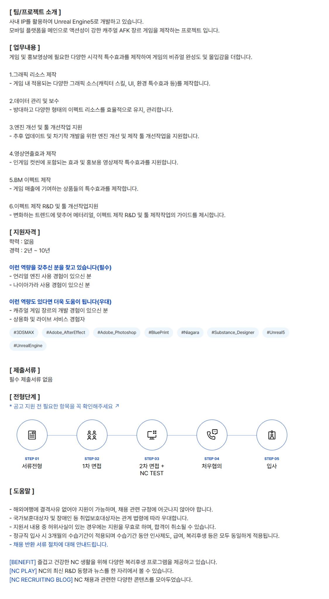 [ ÆÀ/ÇÁ·ÎÁ§Æ® ¼Ò°³ ] »ç³» IP¸¦ Ȱ¿ëÇÏ¿© Unreal Engine5·Î °³¹ßÇϰí ÀÖ½À´Ï´Ù. ¸ð¹ÙÀÏ Ç÷§ÆûÀ» ¸ÞÀÎÀ¸·Î ¾×¼Ç¼ºÀÌ °­ÇÑ Ä³ÁÖ¾ó AFK À帣 °ÔÀÓÀ» Á¦ÀÛÇÏ´Â ÇÁ·ÎÁ§Æ® ÀÔ´Ï´Ù. [ ¾÷¹«³»¿ë ] °ÔÀÓ ¹× È«º¸¿µ»ó¿¡ ÇÊ¿äÇÑ ´Ù¾çÇÑ ½Ã°¢Àû Ư¼öÈ¿°ú¸¦ Á¦ÀÛÇÏ¿© °ÔÀÓÀÇ ºñÁê¾ó ¿Ï¼ºµµ ¹× ¸ôÀÔ°¨À» ´õÇÕ´Ï´Ù. 1.±×·¡ÇÈ ¸®¼Ò½º Á¦ÀÛ - °ÔÀÓ ³» Àû¿ëµÇ´Â ´Ù¾çÇÑ ±×·¡ÇÈ ¼Ò½º(ij¸¯ÅÍ ½ºÅ³, UI, ȯ°æ Ư¼öÈ¿°ú µî)¸¦ Á¦ÀÛÇÕ´Ï´Ù. 2.µ¥ÀÌÅÍ °ü¸® ¹× º¸¼ö - ¹æ´ëÇÏ°í ´Ù¾çÇÑ ÇüÅÂÀÇ ÀÌÆåÆ® ¸®¼Ò½º¸¦ È¿À²ÀûÀ¸·Î À¯Áö, °ü¸®ÇÕ´Ï´Ù. 3.¿£Áø °³¼± ¹× Åø °³¼±ÀÛ¾÷ Áö¿ø - ÃßÈÄ ¾÷µ¥ÀÌÆ® ¹× Â÷±âÀÛ °³¹ßÀ» À§ÇÑ ¿£Áø °³¼± ¹× Á¦ÀÛ Åø °³¼±ÀÛ¾÷À» Áö¿øÇÕ´Ï´Ù. 4.¿µ»ó¿¬ÃâÈ¿°ú Á¦ÀÛ - ÀΰÔÀÓ ÄÆ¾À¿¡ Æ÷ÇԵǴ ȿ°ú ¹× È«º¸¿ë ¿µ»óÁ¦ÀÛ Æ¯¼öÈ¿°ú¸¦ Áö¿øÇÕ´Ï´Ù. 5.BM ÀÌÆåÆ® Á¦ÀÛ - °ÔÀÓ ¸ÅÃâ¿¡ ±â¿©ÇÏ´Â »óǰµéÀÇ Æ¯¼öÈ¿°ú¸¦ Á¦ÀÛÇÕ´Ï´Ù. 6.ÀÌÆåÆ® Á¦ÀÛ R&D ¹× Åø °³¼±ÀÛ¾÷Áö¿ø - º¯È­ÇÏ´Â Æ®·»µå¿¡ ¸ÂÃß¾î ¸ÞÅ͸®¾ó, ÀÌÆåÆ® Á¦ÀÛ R&D ¹× Åø Á¦ÀÛÀÛ¾÷ÀÇ °¡À̵带 Á¦½ÃÇÕ´Ï´Ù. [ Áö¿øÀÚ°Ý ] Çз : ¾øÀ½ °æ·Â : 2³â ~ 10³â