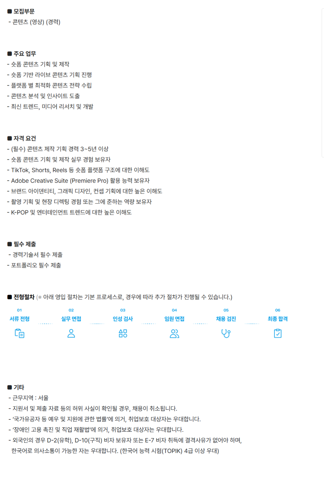 ¡á ¸ðÁýºÎ¹® - ÄÜÅÙÃ÷ ​(¿µ»ó) ​(°æ·Â) ¡á ​ÁÖ¿ä ¾÷¹« - ​¼ôÆû ÄÜÅÙÃ÷ ±âȹ ¹× ​Á¦ÀÛ - ​¼ôÆû ±â¹Ý ​¶óÀ̺ê ÄÜÅÙÃ÷ ±âȹ ​ÁøÇà - Ç÷§Æû ​º° ​ÃÖÀûÈ­ ÄÜÅÙÃ÷ ​Àü·« ​¼ö¸³ - ​ÄÜÅÙÃ÷ ºÐ¼® ¹× ​ÀλçÀÌÆ® ​µµÃâ - ÃֽŠƮ·»µå, ​¹Ìµð¾î ​¸®¼­Ä¡ ​¹× °³¹ß ¡á ÀÚ°Ý ​¿ä°Ç - (Çʼö) ​ÄÜÅÙÃ÷ ​Á¦ÀÛ ±âȹ ​°æ·Â 3~5³â ​ÀÌ»ó - ​¼ôÆû ÄÜÅÙÃ÷ ±âȹ ​¹× Á¦ÀÛ ​½Ç¹« °æÇè º¸À¯ÀÚ - TikTok, Shorts, Reels µî ¼ôÆû Ç÷§Æû ±¸Á¶¿¡ ´ëÇÑ ÀÌÇØµµ - Adobe Creative Suite (Premiere Pro) Ȱ¿ë ´É·Â º¸À¯ÀÚ - ºê·£µå ¾ÆÀ̵§Æ¼Æ¼, ±×·¡ÇÈ µðÀÚÀÎ, ÄÁ¼Á ±âȹ¿¡ ´ëÇÑ ³ôÀº ÀÌÇØµµ - ÃÔ¿µ ±âȹ ¹× ÇöÀå µð·ºÆÃ °æÇè ¶Ç´Â ±×¿¡ ÁØÇÏ´Â ¿ª·® º¸À¯ÀÚ - K-POP ¹× ¿£ÅÍÅ×ÀÎ¸ÕÆ® Æ®·»µå¿¡ ´ëÇÑ ³ôÀº ÀÌÇØµµ