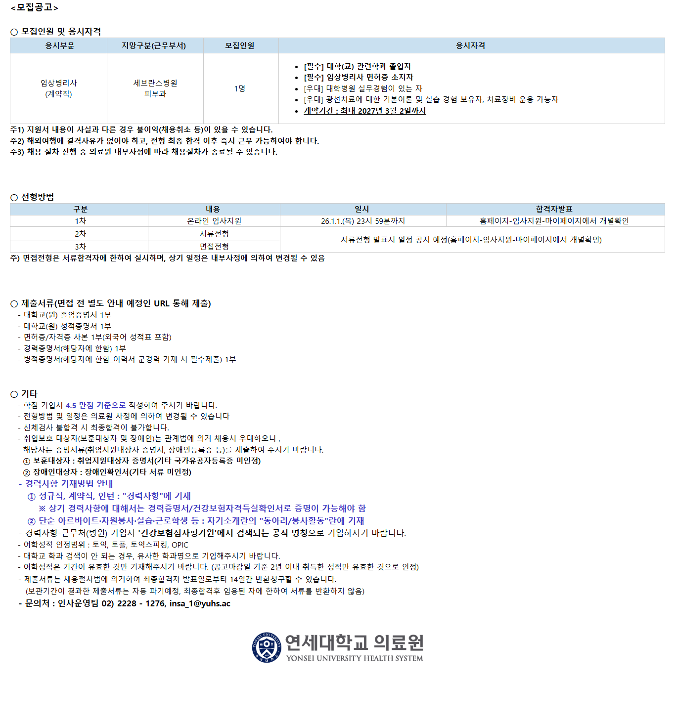 <¸ðÁý°ø°í> ¡Û ¸ðÁýÀοø ¹× ÀÀ½ÃÀÚ°Ý ÀÀ½ÃºÎ¹® Áö¸Á±¸ºÐ(±Ù¹«ºÎ¼­) ¸ðÁýÀοø ÀÀ½ÃÀÚ°Ý ÀÓ»óº´¸®»ç (°è¾àÁ÷) ¼¼ºê¶õ½ºº´¿ø ÇǺΰú 1¸í [Çʼö] ´ëÇÐ(±³) °ü·ÃÇаú Á¹¾÷ÀÚ [Çʼö] ÀÓ»óº´¸®»ç ¸éÇãÁõ ¼ÒÁöÀÚ ​[¿ì´ë] ´ëÇк´¿ø ½Ç¹«°æÇèÀÌ ÀÖ´Â ÀÚ [¿ì´ë] ±¤¼±Ä¡·á¿¡ ´ëÇÑ ±âº»ÀÌ·Ð ¹× ½Ç½À °æÇè º¸À¯ÀÚ, Ä¡·áÀåºñ ¿î¿ë °¡´ÉÀÚ °è¾à±â°£ : ÃÖ´ë 2027³â 3¿ù 2ÀϱîÁö ÁÖ1) Áö¿ø¼­ ³»¿ëÀÌ »ç½Ç°ú ´Ù¸¥ °æ¿ì ºÒÀÌÀÍ(ä¿ëÃë¼Ò µî)ÀÌ ÀÖÀ» ¼ö ÀÖ½À´Ï´Ù. ÁÖ2) ÇØ¿Ü¿©Çà¿¡ °á°Ý»çÀ¯°¡ ¾ø¾î¾ß Çϰí, ÀüÇü ÃÖÁ¾ ÇÕ°Ý ÀÌÈÄ Áï½Ã ±Ù¹« °¡´ÉÇÏ¿©¾ß ÇÕ´Ï´Ù. ÁÖ3) ä¿ë ÀýÂ÷ ÁøÇà Áß ÀÇ·á¿ø ³»ºÎ»çÁ¤¿¡ µû¶ó ä¿ëÀýÂ÷°¡ Á¾·áµÉ ¼ö ÀÖ½À´Ï´Ù. ¡Û ÀüÇü¹æ¹ý ±¸ºÐ ³»¿ë ÀϽà ÇÕ°ÝÀÚ¹ßÇ¥ 1Â÷ ¿Â¶óÀÎ ÀÔ»çÁö¿ø 26.1.1.(¸ñ) 23½Ã 59ºÐ±îÁö ȨÆäÀÌÁö-ÀÔ»çÁö¿ø-¸¶ÀÌÆäÀÌÁö¿¡¼­ °³º°È®ÀÎ 2Â÷ ¼­·ùÀüÇü ¼­·ùÀüÇü ¹ßÇ¥½Ã ÀÏÁ¤ °øÁö ¿¹Á¤(ȨÆäÀÌÁö-ÀÔ»çÁö¿ø-¸¶ÀÌÆäÀÌÁö¿¡¼­ °³º°È®ÀÎ) 3Â÷ ¸éÁ¢ÀüÇü ÁÖ) ¸éÁ¢ÀüÇüÀº ¼­·ùÇÕ°ÝÀÚ¿¡ ÇÑÇÏ¿© ½Ç½ÃÇϸç, »ó±â ÀÏÁ¤Àº ³»ºÎ»çÁ¤¿¡ ÀÇÇÏ¿© º¯°æµÉ ¼ö ÀÖÀ½ ¡Û Á¦Ãâ¼­·ù(¸éÁ¢ Àü º°µµ ¾È³» ¿¹Á¤ÀÎ URL ÅëÇØ Á¦Ãâ) - ​´ëÇб³(¿ø) Á¹¾÷Áõ¸í¼­ 1ºÎ - ´ëÇб³(¿ø) ¼ºÀûÁõ¸í¼­ 1ºÎ - ¸éÇãÁõ/ÀÚ°ÝÁõ »çº» 1ºÎ(¿Ü±¹¾î ¼ºÀûÇ¥ Æ÷ÇÔ) - °æ·ÂÁõ¸í¼­(ÇØ´çÀÚ¿¡ ÇÑÇÔ) 1ºÎ - º´ÀûÁõ¸í¼­(ÇØ´çÀÚ¿¡ ÇÑÇÔ_À̷¼­ ±º°æ·Â ±âÀç ½Ã ÇʼöÁ¦Ãâ) 1ºÎ ¡Û ±âŸ - ÇÐÁ¡ ±âÀԽà 4.5 ¸¸Á¡ ±âÁØÀ¸·Î ÀÛ¼ºÇÏ¿© Áֽñ⠹ٶø´Ï´Ù. - ÀüÇü¹æ¹ý ¹× ÀÏÁ¤Àº ÀÇ·á¿ø »çÁ¤¿¡ ÀÇÇÏ¿© º¯°æµÉ ¼ö ÀÖ½À´Ï´Ù - ½Åü°Ë»ç ºÒÇÕ°Ý ½Ã ÃÖÁ¾ÇÕ°ÝÀÌ ºÒ°¡ÇÕ´Ï´Ù. - Ãë¾÷º¸È£ ´ë»óÀÚ(º¸ÈÆ´ë»óÀÚ ¹× Àå¾ÖÀÎ)´Â °ü°è¹ý¿¡ ÀǰŠä¿ë½Ã ¿ì´ëÇÏ¿À´Ï , ÇØ´çÀÚ´Â Áõºù¼­·ù(Ãë¾÷Áö¿ø´ë»óÀÚ Áõ¸í¼­, Àå¾ÖÀεî·ÏÁõ µî)¸¦ Á¦ÃâÇÏ¿© Áֽñ⠹ٶø´Ï´Ù. ¨ç º¸ÈÆ´ë»óÀÚ : Ãë¾÷Áö¿ø´ë»óÀÚ Áõ¸í¼­(±âŸ ±¹°¡À¯°øÀÚµî·ÏÁõ ¹ÌÀÎÁ¤) ¨è Àå¾ÖÀδë»óÀÚ : Àå¾ÖÀÎÈ®Àμ­(±âŸ ¼­·ù ¹ÌÀÎÁ¤) - °æ·Â»çÇ× ±âÀç¹æ¹ý ¾È³» ¨ç Á¤±ÔÁ÷, °è¾àÁ÷, ÀÎÅÏ : "°æ·Â»çÇ×"¿¡ ±âÀç ¡Ø »ó±â °æ·Â»çÇ׿¡ ´ëÇØ¼­´Â °æ·ÂÁõ¸í¼­/°Ç°­º¸ÇèÀڰݵæ½ÇÈ®Àμ­·Î Áõ¸íÀÌ °¡´ÉÇØ¾ß ÇÔ ¨è ´Ü¼ø ¾Æ¸£¹ÙÀÌÆ®¡¤ÀÚ¿øºÀ»ç¡¤½Ç½À¡¤±Ù·ÎÇлý µî : ÀÚ±â¼Ò°³¶õÀÇ "µ¿¾Æ¸®/ºÀ»çȰµ¿"¶õ¿¡ ±âÀç - °æ·Â»çÇ×-±Ù¹«Ã³(º´¿ø) ±âÀԽà '°Ç°­º¸Çè½É»çÆò°¡¿ø'¿¡¼­ °Ë»öµÇ´Â °ø½Ä ¸íĪÀ¸·Î ±âÀÔÇϽñ⠹ٶø´Ï´Ù. - ¾îÇмºÀû ÀÎÁ¤¹üÀ§ : ÅäÀÍ, ÅäÇÃ, ÅäÀͽºÇÇÅ·, OPIC - ´ëÇб³ Çаú °Ë»öÀÌ ¾È µÇ´Â °æ¿ì, À¯»çÇÑ Çаú¸íÀ¸·Î ±âÀÔÇØÁֽñ⠹ٶø´Ï´Ù. - ¾îÇмºÀûÀº ±â°£ÀÌ À¯È¿ÇÑ °Í¸¸ ±âÀçÇØÁֽñ⠹ٶø´Ï´Ù. (°ø°í¸¶°¨ÀÏ ±âÁØ 2³â À̳» ÃëµæÇÑ ¼ºÀû¸¸ À¯È¿ÇÑ °ÍÀ¸·Î ÀÎÁ¤) - Á¦Ãâ¼­·ù´Â ä¿ëÀýÂ÷¹ý¿¡ ÀǰÅÇÏ¿© ÃÖÁ¾ÇÕ°ÝÀÚ ¹ßÇ¥ÀϷκÎÅÍ 14Àϰ£ ¹Ýȯû±¸ÇÒ ¼ö ÀÖ½À´Ï´Ù. (º¸°ü±â°£ÀÌ °á°úÇÑ Á¦Ãâ¼­·ù´Â ÀÚµ¿ ÆÄ±â¿¹Á¤, ÃÖÁ¾ÇÕ°ÝÈÄ ÀÓ¿ëµÈ ÀÚ¿¡ ÇÑÇÏ¿© ¼­·ù¸¦ ¹ÝȯÇÏÁö ¾ÊÀ½) - ¹®ÀÇó : Àλç¿î¿µÆÀ ***-****-****, ******@*******.***