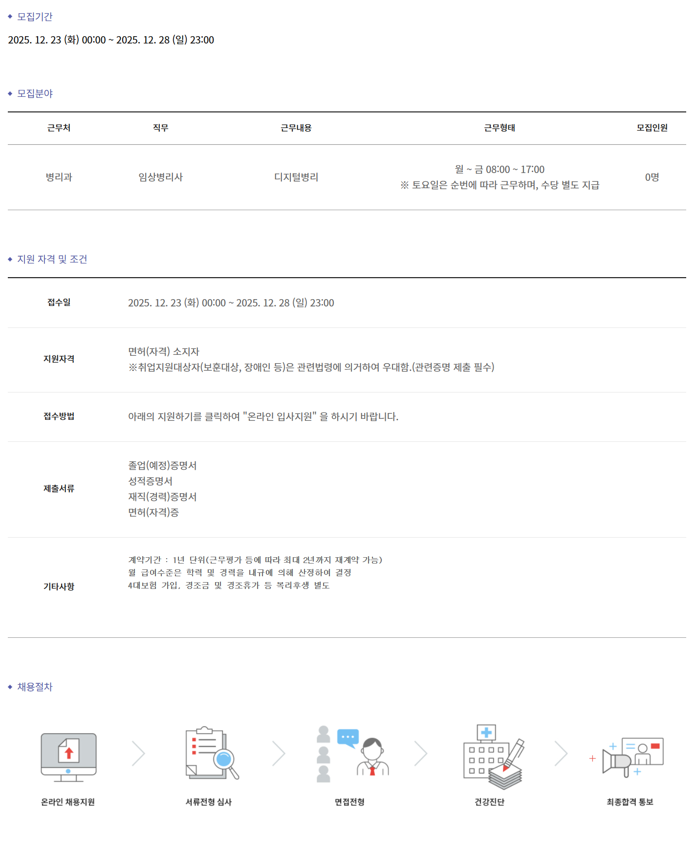 ±Ù¹«Ã³ Á÷¹« ±Ù¹«³»¿ë ±Ù¹«ÇüÅ ¸ðÁýÀοø º´¸®°ú ÀÓ»óº´¸®»ç µðÁöÅк´¸® ¿ù ~ ±Ý 08:00 ~ 17:00 ¡Ø Åä¿äÀÏÀº ¼ø¹ø¿¡ µû¶ó ±Ù¹«Çϸç, ¼ö´ç º°µµ Áö±Þ 0¸í