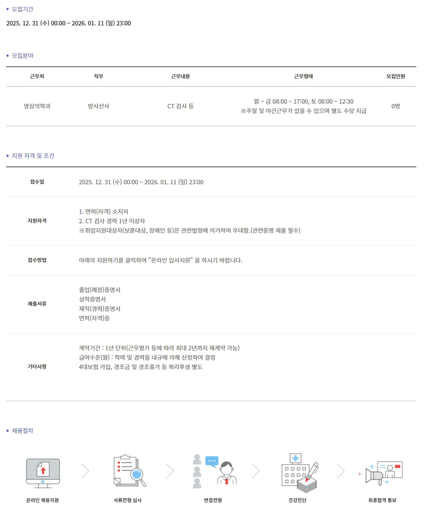 ±Ù¹«Ã³ Á÷¹« ±Ù¹«³»¿ë ±Ù¹«ÇüÅ ¸ðÁýÀοø ¿µ»óÀÇÇаú ¹æ»ç¼±»ç CT °Ë»ç µî ¿ù ~ ±Ý 08:00 ~ 17:00, Åä 08:00 ~ 12:30 ¡ØÁÖ¸» ¹× ¾ß°£±Ù¹«°¡ ÀÖÀ» ¼ö ÀÖÀ¸¸ç º°µµ ¼ö´ç Áö±Þ 0¸í