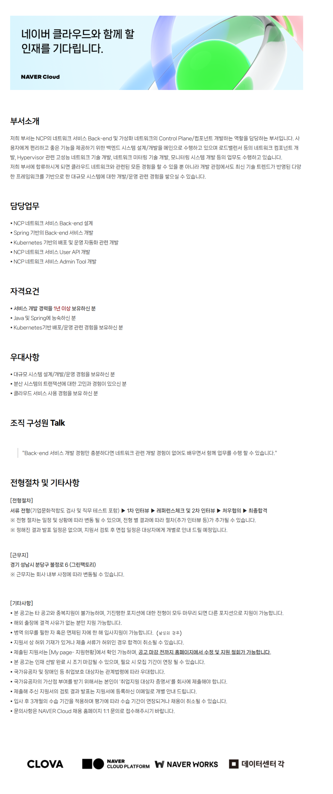 ÀúÈñ ºÎ¼´Â NCPÀÇ ³×Æ®¿öÅ© ¼ºñ½º Back-end ¹× °¡»óÈ ³×Æ®¿öÅ©ÀÇ Control Plane/ÄÄÆ÷³ÍÆ® °³¹ßÇÏ´Â ¿ªÇÒÀ» ´ã´çÇÏ´Â ºÎ¼ÀÔ´Ï´Ù. »ç¿ëÀÚ¿¡°Ô Æí¸®Çϰí ÁÁÀº ±â´ÉÀ» Á¦°øÇϱâ À§ÇÑ ¹é¿£µå ½Ã½ºÅÛ ¼³°è/°³¹ßÀ» ¸ÞÀÎÀ¸·Î ¼öÇàÇϰí ÀÖÀ¸¸ç ·Îµå¹ë·±¼ µîÀÇ ³×Æ®¿öÅ© ÄÄÆ÷³ÍÆ® °³¹ß, Hypervisor °ü·Ã °í¼º´É ³×Æ®¿öÅ© ±â¼ú °³¹ß, ³×Æ®¿öÅ© ¹ÌÅ͸µ ±â¼ú °³¹ß, ¸ð´ÏÅ͸µ ½Ã½ºÅÛ °³¹ß µîÀÇ ¾÷¹«µµ ¼öÇàÇϰí ÀÖ½À´Ï´Ù.