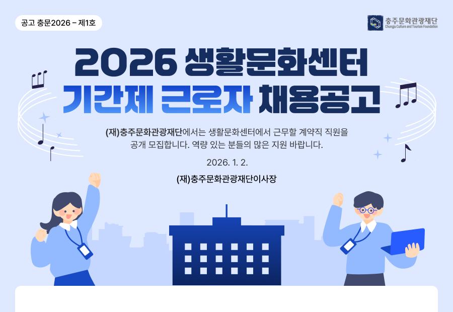 • ÃæÁÖ»ýȰ¹®È­¼¾ÅÍ Ã¤¿ëÀοø: ±âȹ½ÇÀå 1¸í, ÇàÁ¤ÁÖÀÓ 1¸í