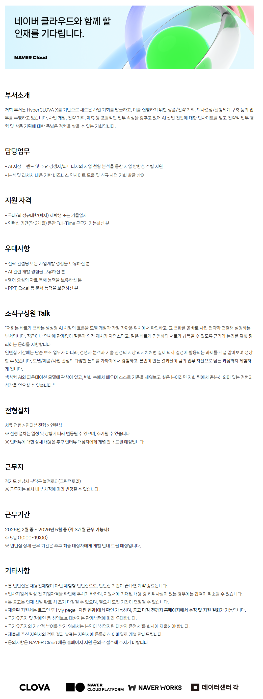 ÀúÈñ ºÎ¼´Â HyperCLOVA X¸¦ ±â¹ÝÀ¸·Î »õ·Î¿î »ç¾÷ ±âȸ¸¦ ¹ß±¼Çϰí, À̸¦ ½ÇÇàÇϱâ À§ÇÑ »óǰ/Àü·« ±âȹ, ÀÇ»ç°áÁ¤/½ÇÇàü°è ±¸Ãà µîÀÇ ¾÷¹«¸¦ ¼öÇàÇϰí ÀÖ½À´Ï´Ù. »ç¾÷ °³¹ß, Àü·« ±âȹ, Á¦ÈÞ µî Æ÷°ýÀûÀÎ ¾÷¹« ¼Ó¼ºÀ» °®Ãß°í ÀÖ¾î AI »ê¾÷ Àü¹Ý¿¡ ´ëÇÑ ÀλçÀÌÆ®¸¦ ¾ò°í Àü·«Àû ¾÷¹« °æÇè ¹× »óǰ ±âȹ¿¡ ´ëÇÑ Æø³ÐÀº °æÇèÀ» ½×À» ¼ö ÀÖ´Â ±âȸÀÔ´Ï´Ù.