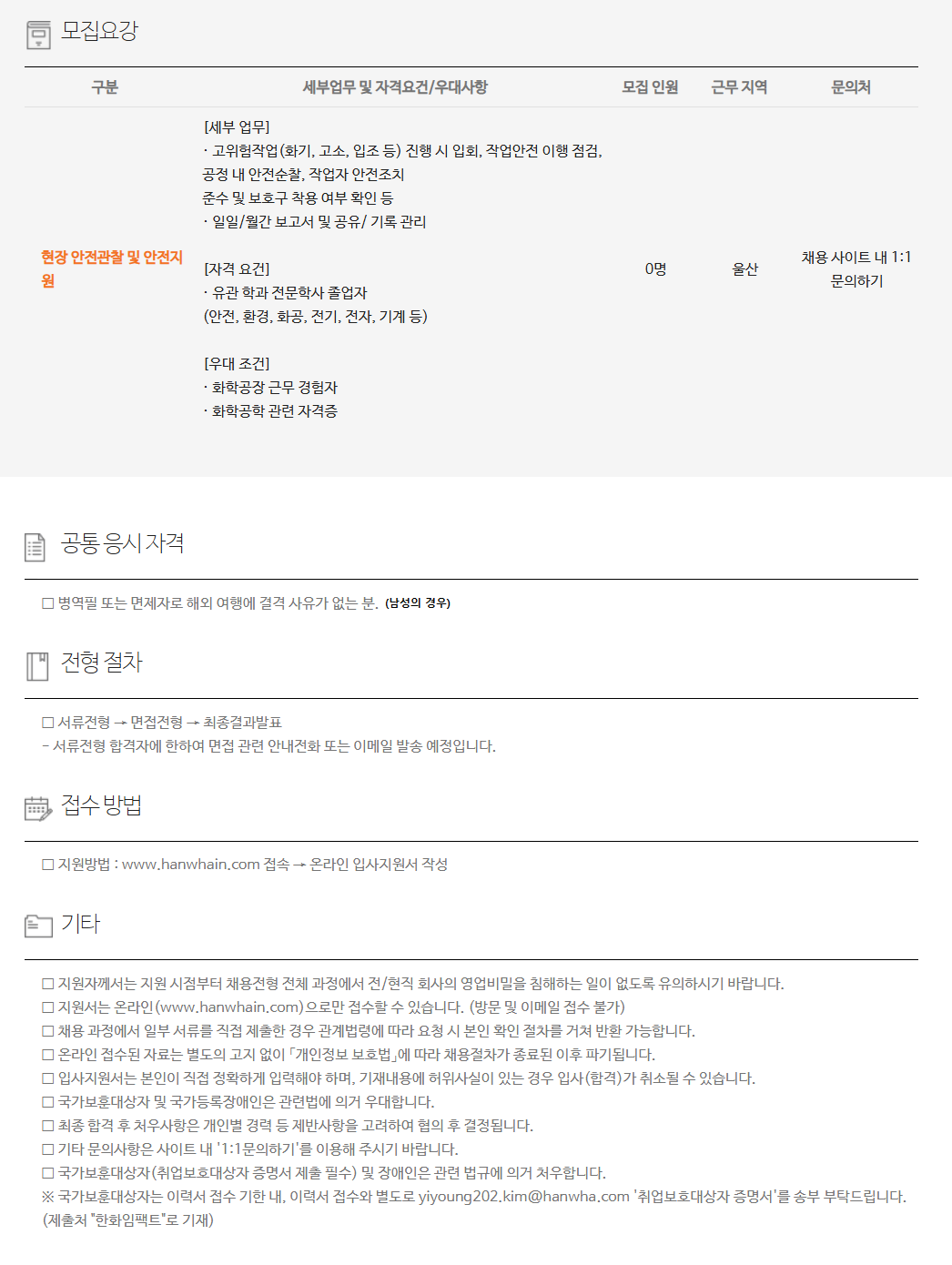 ±¸ºÐ ¼¼ºÎ¾÷¹« ¹× ÀÚ°Ý¿ä°Ç/¿ì´ë»çÇ× ¸ðÁý Àοø ±Ù¹« Áö¿ª ¹®ÀÇó ÇöÀå ¾ÈÀü°üÂû ¹× ¾ÈÀüÁö¿ø [¼¼ºÎ ¾÷¹«] ¡¤ °íÀ§ÇèÀÛ¾÷(È­±â, °í¼Ò, ÀÔÁ¶ µî) ÁøÇà ½Ã ÀÔȸ, ÀÛ¾÷¾ÈÀü ÀÌÇà Á¡°Ë, °øÁ¤ ³» ¾ÈÀü¼øÂû, ÀÛ¾÷ÀÚ ¾ÈÀüÁ¶Ä¡ Áؼö ¹× º¸È£±¸ Âø¿ë ¿©ºÎ È®ÀÎ µî ¡¤ ÀÏÀÏ/¿ù°£ º¸°í¼­ ¹× °øÀ¯/ ±â·Ï °ü¸® [ÀÚ°Ý ¿ä°Ç] ¡¤ À¯°ü Çаú Àü¹®Çлç Á¹¾÷ÀÚ (¾ÈÀü, ȯ°æ, È­°ø, Àü±â, ÀüÀÚ, ±â°è µî) [¿ì´ë Á¶°Ç] ¡¤ È­ÇаøÀå ±Ù¹« °æÇèÀÚ ¡¤ È­ÇаøÇÐ °ü·Ã ÀÚ°ÝÁõ 0¸í ¿ï»ê ä¿ë »çÀÌÆ® ³» 1:1 ¹®ÀÇÇϱâ