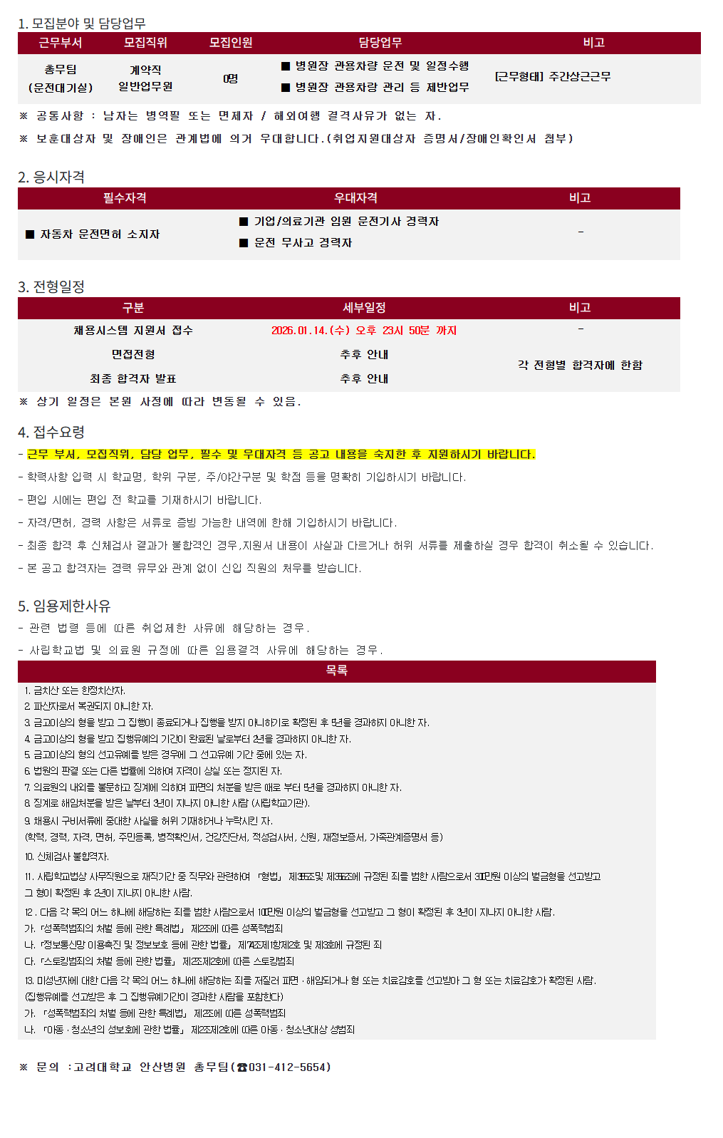 [¾È»êº´¿ø25-218] Ãѹ«ÆÀ(¿îÀü´ë±â½Ç) °è¾àÁ÷ÀϹݾ÷¹«¿ø ¸ðÁý(º´¿øÀå °ü¿ëÂ÷·® ¿îÀü)