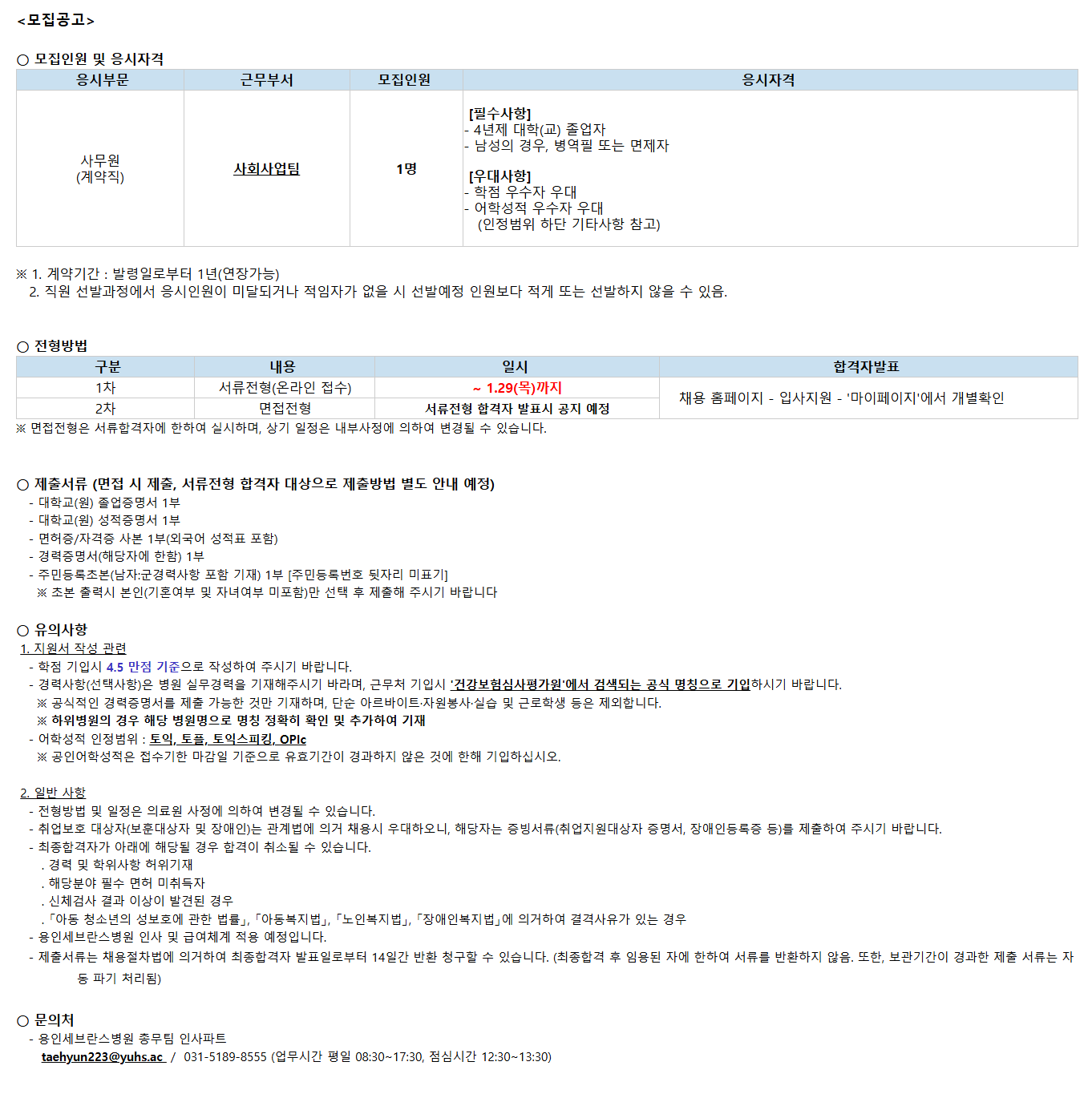 <¸ðÁý°ø°í> ¡Û ¸ðÁýÀοø ¹× ÀÀ½ÃÀÚ°Ý ÀÀ½ÃºÎ¹® ±Ù¹«ºÎ¼­ ¸ðÁýÀοø ÀÀ½ÃÀÚ°Ý »ç¹«¿ø (°è¾àÁ÷) »çȸ»ç¾÷ÆÀ 1¸í [Çʼö»çÇ×] - 4³âÁ¦ ´ëÇÐ(±³) Á¹¾÷ÀÚ - ³²¼ºÀÇ °æ¿ì, º´¿ªÇÊ ¶Ç´Â ¸éÁ¦ÀÚ [¿ì´ë»çÇ×] - ÇÐÁ¡ ¿ì¼öÀÚ ¿ì´ë - ¾îÇмºÀû ¿ì¼öÀÚ ¿ì´ë (ÀÎÁ¤¹üÀ§ ÇÏ´Ü ±âŸ»çÇ× Âü°í) ¡Ø 1. °è¾à±â°£ : ¹ß·ÉÀϷκÎÅÍ 1³â(¿¬Àå°¡´É) 2. Á÷¿ø ¼±¹ß°úÁ¤¿¡¼­ ÀÀ½ÃÀοøÀÌ ¹Ì´ÞµÇ°Å³ª ÀûÀÓÀÚ°¡ ¾øÀ» ½Ã ¼±¹ß¿¹Á¤ Àοøº¸´Ù Àû°Ô ¶Ç´Â ¼±¹ßÇÏÁö ¾ÊÀ» ¼ö ÀÖÀ½. ¡Û ÀüÇü¹æ¹ý ±¸ºÐ ³»¿ë ÀϽà ÇÕ°ÝÀÚ¹ßÇ¥ 1Â÷ ¼­·ùÀüÇü(¿Â¶óÀÎ Á¢¼ö) ~ 1.29(¸ñ)±îÁö ä¿ë ȨÆäÀÌÁö - ÀÔ»çÁö¿ø - '¸¶ÀÌÆäÀÌÁö'¿¡¼­ °³º°È®ÀÎ 2Â÷ ¸éÁ¢ÀüÇü ¼­·ùÀüÇü ÇÕ°ÝÀÚ ¹ßÇ¥½Ã °øÁö ¿¹Á¤ ¡Ø ¸éÁ¢ÀüÇüÀº ¼­·ùÇÕ°ÝÀÚ¿¡ ÇÑÇÏ¿© ½Ç½ÃÇϸç, »ó±â ÀÏÁ¤Àº ³»ºÎ»çÁ¤¿¡ ÀÇÇÏ¿© º¯°æµÉ ¼ö ÀÖ½À´Ï´Ù.  ¡Û Á¦Ãâ¼­·ù (¸éÁ¢ ½Ã Á¦Ãâ, ¼­·ùÀüÇü ÇÕ°ÝÀÚ ´ë»óÀ¸·Î Á¦Ãâ¹æ¹ý º°µµ ¾È³» ¿¹Á¤) - ​´ëÇб³(¿ø) Á¹¾÷Áõ¸í¼­ 1ºÎ - ´ëÇб³(¿ø) ¼ºÀûÁõ¸í¼­ 1ºÎ - ¸éÇãÁõ/ÀÚ°ÝÁõ »çº» 1ºÎ(¿Ü±¹¾î ¼ºÀûÇ¥ Æ÷ÇÔ) - °æ·ÂÁõ¸í¼­(ÇØ´çÀÚ¿¡ ÇÑÇÔ) 1ºÎ - Áֹεî·ÏÃʺ»(³²ÀÚ:±º°æ·Â»çÇ× Æ÷ÇÔ ±âÀç) 1ºÎ [Áֹεî·Ï¹øÈ£ µÞÀÚ¸® ¹ÌÇ¥±â] ¡Ø Ãʺ» Ãâ·Â½Ã º»ÀÎ(±âÈ¥¿©ºÎ ¹× Àڳ࿩ºÎ ¹ÌÆ÷ÇÔ)¸¸ ¼±Åà ÈÄ Á¦ÃâÇØ Áֽñ⠹ٶø´Ï´Ù ¡Û À¯ÀÇ»çÇ× 1. Áö¿ø¼­ ÀÛ¼º °ü·Ã - ÇÐÁ¡ ±âÀԽà 4.5 ¸¸Á¡ ±âÁØÀ¸·Î ÀÛ¼ºÇÏ¿© Áֽñ⠹ٶø´Ï´Ù. - °æ·Â»çÇ×(¼±ÅûçÇ×)Àº º´¿ø ½Ç¹«°æ·ÂÀ» ±âÀçÇØÁֽñ⠹ٶó¸ç, ±Ù¹«Ã³ ±âÀԽà '°Ç°­º¸Çè½É»çÆò°¡¿ø'¿¡¼­ °Ë»öµÇ´Â °ø½Ä ¸íĪÀ¸·Î ±âÀÔÇϽñ⠹ٶø´Ï´Ù. ¡Ø °ø½ÄÀûÀÎ °æ·ÂÁõ¸í¼­¸¦ Á¦Ãâ °¡´ÉÇÑ °Í¸¸ ±âÀçÇϸç, ´Ü¼ø ¾Æ¸£¹ÙÀÌÆ®¡¤ÀÚ¿øºÀ»ç¡¤½Ç½À ¹× ±Ù·ÎÇлý µîÀº Á¦¿ÜÇÕ´Ï´Ù. ¡Ø ÇÏÀ§º´¿øÀÇ °æ¿ì ÇØ´ç º´¿ø¸íÀ¸·Î ¸íĪ Á¤È®È÷ È®ÀÎ ¹× Ãß°¡ÇÏ¿© ±âÀç - ¾îÇмºÀû ÀÎÁ¤¹üÀ§ : ÅäÀÍ, ÅäÇÃ, ÅäÀͽºÇÇÅ·, OPIc ¡Ø °øÀξîÇмºÀûÀº Á¢¼ö±âÇÑ ¸¶°¨ÀÏ ±âÁØÀ¸·Î À¯È¿±â°£ÀÌ °æ°úÇÏÁö ¾ÊÀº °Í¿¡ ÇÑÇØ ±âÀÔÇϽʽÿÀ. 2. ÀÏ¹Ý »çÇ× - ÀüÇü¹æ¹ý ¹× ÀÏÁ¤Àº ÀÇ·á¿ø »çÁ¤¿¡ ÀÇÇÏ¿© º¯°æµÉ ¼ö ÀÖ½À´Ï´Ù. - Ãë¾÷º¸È£ ´ë»óÀÚ(º¸ÈÆ´ë»óÀÚ ¹× Àå¾ÖÀÎ)´Â °ü°è¹ý¿¡ ÀǰŠä¿ë½Ã ¿ì´ëÇÏ¿À´Ï, ÇØ´çÀÚ´Â Áõºù¼­·ù(Ãë¾÷Áö¿ø´ë»óÀÚ Áõ¸í¼­, Àå¾ÖÀεî·ÏÁõ µî)¸¦ Á¦ÃâÇÏ¿© Áֽñ⠹ٶø´Ï´Ù. - ÃÖÁ¾ÇÕ°ÝÀÚ°¡ ¾Æ·¡¿¡ ÇØ´çµÉ °æ¿ì ÇÕ°ÝÀÌ Ãë¼ÒµÉ ¼ö ÀÖ½À´Ï´Ù. . °æ·Â ¹× ÇÐÀ§»çÇ× ÇãÀ§±âÀç . ÇØ´çºÐ¾ß Çʼö ¸éÇã ¹ÌÃëµæÀÚ . ½Åü°Ë»ç °á°ú ÀÌ»óÀÌ ¹ß°ßµÈ °æ¿ì . ¡¸¾Æµ¿ û¼Ò³âÀÇ ¼ºº¸È£¿¡ °üÇÑ ¹ý·ü¡¹, ¡¸¾Æµ¿º¹Áö¹ý¡¹, ¡¸³ëÀκ¹Áö¹ý¡¹, ¡¸Àå¾ÖÀκ¹Áö¹ý¡¹¿¡ ÀǰÅÇÏ¿© °á°Ý»çÀ¯°¡ ÀÖ´Â °æ¿ì ​ - ¿ëÀμ¼ºê¶õ½ºº´¿ø ÀÎ»ç ¹× ±Þ¿©Ã¼°è Àû¿ë ¿¹Á¤ÀÔ´Ï´Ù. - Á¦Ãâ¼­·ù´Â ä¿ëÀýÂ÷¹ý¿¡ ÀǰÅÇÏ¿© ÃÖÁ¾ÇÕ°ÝÀÚ ¹ßÇ¥ÀϷκÎÅÍ 14Àϰ£ ¹Ýȯ û±¸ÇÒ ¼ö ÀÖ½À´Ï´Ù. (ÃÖÁ¾ÇÕ°Ý ÈÄ ÀÓ¿ëµÈ ÀÚ¿¡ ÇÑÇÏ¿© ¼­·ù¸¦ ¹ÝȯÇÏÁö ¾ÊÀ½. ¶ÇÇÑ, º¸°ü±â°£ÀÌ °æ°úÇÑ Á¦Ãâ ¼­·ù´Â ÀÚµ¿ ÆÄ±â 󸮵Ê) ¡Û ¹®ÀÇó - ¿ëÀμ¼ºê¶õ½ºº´¿ø Ãѹ«ÆÀ ÀλçÆÄÆ® ******@*******.*** / ***-****-**** (¾÷¹«½Ã°£ ÆòÀÏ 08:30~17:30, Á¡½É½Ã°£ 12:30~13:30)