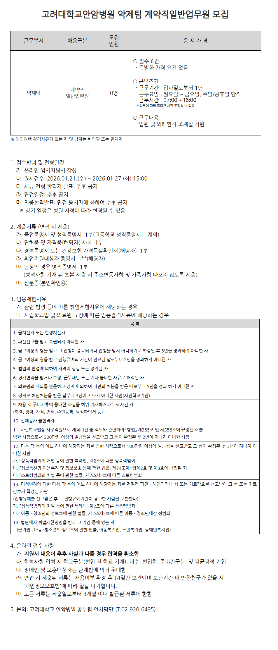 °í·Á´ëÇб³¾È¾Ïº´¿ø ¾àÁ¦ÆÀ °è¾àÁ÷ÀϹݾ÷¹«¿ø ¸ðÁý