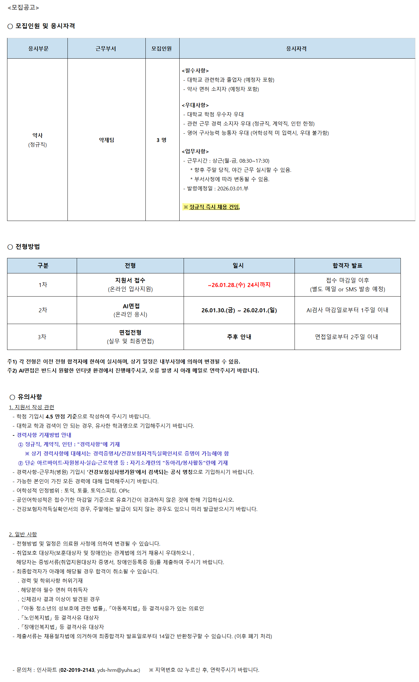 <¸ðÁý°ø°í> ¡Û ¸ðÁýÀοø ¹× ÀÀ½ÃÀÚ°Ý ÀÀ½ÃºÎ¹® ±Ù¹«ºÎ¼­ ¸ðÁýÀοø ÀÀ½ÃÀÚ°Ý ¾à»ç (Á¤±ÔÁ÷) ¾àÁ¦ÆÀ 3 ¸í <Çʼö»çÇ×> - ´ëÇб³ °ü·ÃÇаú Á¹¾÷ÀÚ (¿¹Á¤ÀÚ Æ÷ÇÔ) - ¾à»ç ¸éÇã ¼ÒÁöÀÚ (¿¹Á¤ÀÚ Æ÷ÇÔ) <¿ì´ë»çÇ×> - ´ëÇб³ ÇÐÁ¡ ¿ì¼öÀÚ ¿ì´ë - °ü·Ã ±Ù¹« °æ·Â ¼ÒÁöÀÚ ¿ì´ë (Á¤±ÔÁ÷, °è¾àÁ÷, ÀÎÅÏ ÇÑÁ¤) - ¿µ¾î ±¸»ç´É·Â ´ÉÅëÀÚ ¿ì´ë (¾îÇмºÀû ¹Ì ÀԷ½Ã, ¿ì´ë ºÒ°¡ÇÔ) <¾÷¹«»çÇ×> - ±Ù¹«½Ã°£ : »ó±Ù(¿ù-±Ý, 08:30~17:30) * ÇâÈÄ ÁÖ¸» ´çÁ÷, ¾ß°£ ±Ù¹« ½Ç½ÃÇÒ ¼ö ÀÖÀ½. * ºÎ¼­»çÁ¤¿¡ µû¶ó º¯µ¿µÉ ¼ö ÀÖÀ½. - ¹ß·É¿¹Á¤ÀÏ : 2026.03.01.ºÎ ¡Ø Á¤±ÔÁ÷ Áï½Ã ä¿ë °ÇÀÓ. ¡Û ÀüÇü¹æ¹ý ±¸ºÐ ÀüÇü ÀϽà ÇÕ°ÝÀÚ ¹ßÇ¥ 1Â÷ Áö¿ø¼­ Á¢¼ö (¿Â¶óÀÎ ÀÔ»çÁö¿ø) ~26.01.28.(¼ö) 24½Ã±îÁö Á¢¼ö ¸¶°¨ÀÏ ÀÌÈÄ (º°µµ ¸ÞÀÏ or SMS ¹ß¼Û ¿¹Á¤) 2Â÷ AI¸éÁ¢ (¿Â¶óÀÎ ÀÀ½Ã) 26.01.30.(±Ý) ~ 26.02.01.(ÀÏ) AI°Ë»ç ¸¶°¨ÀϷκÎÅÍ 1ÁÖÀÏ À̳» 3Â÷ ¸éÁ¢ÀüÇü (½Ç¹« ¹× ÃÖÁ¾¸éÁ¢) ÃßÈÄ ¾È³» ¸éÁ¢ÀϷκÎÅÍ 2ÁÖÀÏ À̳» ÁÖ1) °¢ ÀüÇüÀº ÀÌÀü ÀüÇü ÇÕ°ÝÀÚ¿¡ ÇÑÇÏ¿© ½Ç½ÃÇϸç, »ó±â ÀÏÁ¤Àº ³»ºÎ»çÁ¤¿¡ ÀÇÇÏ¿© º¯°æµÉ ¼ö ÀÖÀ½. ÁÖ2) AI¸éÁ¢Àº ¹Ýµå½Ã ¿øÈ°ÇÑ ÀÎÅÍ³Ý È¯°æ¿¡¼­ ÁøÇàÇØÁֽðí, ¿À·ù ¹ß»ý ½Ã ¾Æ·¡ ¸ÞÀÏ·Î ¿¬¶ôÁֽñ⠹ٶø´Ï´Ù. ¡Û À¯ÀÇ»çÇ× 1. Áö¿ø¼­ ÀÛ¼º °ü·Ã - ÇÐÁ¡ ±âÀԽà 4.5 ¸¸Á¡ ±âÁØÀ¸·Î ÀÛ¼ºÇÏ¿© Áֽñ⠹ٶø´Ï´Ù. - ´ëÇб³ Çаú °Ë»öÀÌ ¾È µÇ´Â °æ¿ì, À¯»çÇÑ Çаú¸íÀ¸·Î ±âÀÔÇØÁֽñ⠹ٶø´Ï´Ù. - °æ·Â»çÇ× ±âÀç¹æ¹ý ¾È³» ¨ç Á¤±ÔÁ÷, °è¾àÁ÷, ÀÎÅÏ : "°æ·Â»çÇ×"¿¡ ±âÀç ¡Ø »ó±â °æ·Â»çÇ׿¡ ´ëÇØ¼­´Â °æ·ÂÁõ¸í¼­/°Ç°­º¸ÇèÀڰݵæ½ÇÈ®Àμ­·Î Áõ¸íÀÌ °¡´ÉÇØ¾ß ÇÔ ¨è ´Ü¼ø ¾Æ¸£¹ÙÀÌÆ®¡¤ÀÚ¿øºÀ»ç¡¤½Ç½À¡¤±Ù·ÎÇлý µî : ÀÚ±â¼Ò°³¶õÀÇ "µ¿¾Æ¸®/ºÀ»çȰµ¿"¶õ¿¡ ±âÀç - °æ·Â»çÇ×-±Ù¹«Ã³(º´¿ø) ±âÀԽà '°Ç°­º¸Çè½É»çÆò°¡¿ø'¿¡¼­ °Ë»öµÇ´Â °ø½Ä ¸íĪÀ¸·Î ±âÀÔÇϽñ⠹ٶø´Ï´Ù. - °¡´ÉÇÑ º»ÀÎÀÌ °¡Áø ¸ðµç °æ·Â¿¡ ´ëÇØ ÀÔ·ÂÇØÁֽñ⠹ٶø´Ï´Ù. - ¾îÇмºÀû ÀÎÁ¤¹üÀ§ : ÅäÀÍ, ÅäÇÃ, ÅäÀͽºÇÇÅ·, OPIc - °øÀξîÇмºÀûÀº Á¢¼ö±âÇÑ ¸¶°¨ÀÏ ±âÁØÀ¸·Î À¯È¿±â°£ÀÌ °æ°úÇÏÁö ¾ÊÀº °Í¿¡ ÇÑÇØ ±âÀÔÇϽʽÿÀ. - °Ç°­º¸ÇèÀڰݵæ½ÇÈ®Àμ­ÀÇ °æ¿ì, ÁÖ¸»¿¡´Â ¹ß±ÞÀÌ µÇÁö ¾Ê´Â °æ¿ìµµ ÀÖÀ¸´Ï ¹Ì¸® ¹ß±Þ¹ÞÀ¸½Ã±â ¹Ù¶ø´Ï´Ù. 2. ÀÏ¹Ý »çÇ× - ÀüÇü¹æ¹ý ¹× ÀÏÁ¤Àº ÀÇ·á¿ø »çÁ¤¿¡ ÀÇÇÏ¿© º¯°æµÉ ¼ö ÀÖ½À´Ï´Ù. - Ãë¾÷º¸È£ ´ë»óÀÚ(º¸ÈÆ´ë»óÀÚ ¹× Àå¾ÖÀÎ)´Â °ü°è¹ý¿¡ ÀǰŠä¿ë½Ã ¿ì´ëÇÏ¿À´Ï , ÇØ´çÀÚ´Â Áõºù¼­·ù(Ãë¾÷Áö¿ø´ë»óÀÚ Áõ¸í¼­, Àå¾ÖÀεî·ÏÁõ µî)¸¦ Á¦ÃâÇÏ¿© Áֽñ⠹ٶø´Ï´Ù. - ÃÖÁ¾ÇÕ°ÝÀÚ°¡ ¾Æ·¡¿¡ ÇØ´çµÉ °æ¿ì ÇÕ°ÝÀÌ Ãë¼ÒµÉ ¼ö ÀÖ½À´Ï´Ù. . °æ·Â ¹× ÇÐÀ§»çÇ× ÇãÀ§±âÀç . ÇØ´çºÐ¾ß Çʼö ¸éÇã ¹ÌÃëµæÀÚ . ½Åü°Ë»ç °á°ú ÀÌ»óÀÌ ¹ß°ßµÈ °æ¿ì . ¡¸¾Æµ¿ û¼Ò³âÀÇ ¼ºº¸È£¿¡ °üÇÑ ¹ý·ü¡¹, ¡¸¾Æµ¿º¹Áö¹ý¡¹ µî °á°Ý»çÀ¯°¡ ÀÖ´Â ÀÇ·áÀÎ . ¡¸³ëÀκ¹Áö¹ý¡¹ µî °á°Ý»çÀ¯ ´ë»óÀÚ . ¡¸Àå¾ÖÀκ¹Áö¹ý¡¹ µî °á°Ý»çÀ¯ ´ë»óÀÚ - Á¦Ãâ¼­·ù´Â ä¿ëÀýÂ÷¹ý¿¡ ÀǰÅÇÏ¿© ÃÖÁ¾ÇÕ°ÝÀÚ ¹ßÇ¥ÀϷκÎÅÍ 14Àϰ£ ¹Ýȯû±¸ÇÒ ¼ö ÀÖ½À´Ï´Ù. (ÀÌÈÄ Æó±â ó¸®) - ¹®ÀÇó : ÀλçÆÄÆ® (***-****-****, ******@*******.***) ¡Ø Áö¿ª¹øÈ£ 02 ´©¸£½Å ÈÄ, ¿¬¶ôÁֽñ⠹ٶø´Ï´Ù.
