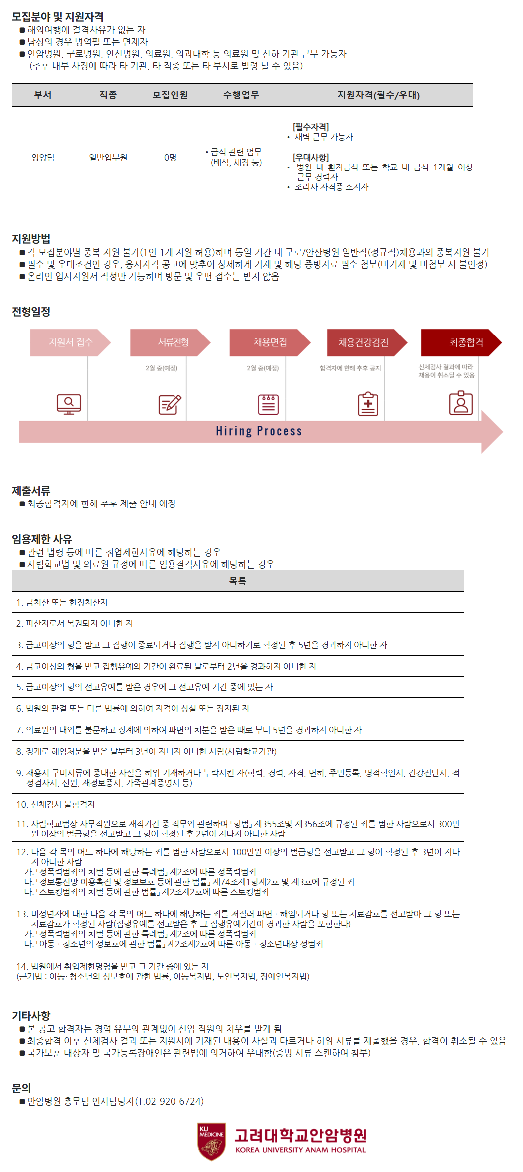 °í·Á´ëÇб³ÀÇ·á¿ø(¾È¾Ïº´¿ø) ½Å±Ô ±³Á÷¿ø(Á¤±ÔÁ÷) ¸ðÁý(¿µ¾çÆÀ) ¸ðÁýºÐ¾ß ¹× Áö¿øÀÚ°Ý ¡á ÇØ¿Ü¿©Çà¿¡ °á°Ý»çÀ¯°¡ ¾ø´Â ÀÚ ¡á ³²¼ºÀÇ °æ¿ì º´¿ªÇÊ ¶Ç´Â ¸éÁ¦ÀÚ ¡á ¾È¾Ïº´¿ø, ±¸·Îº´¿ø, ¾È»êº´¿ø, ÀÇ·á¿ø, Àǰú´ëÇÐ µî ÀÇ·á¿ø ¹× »êÇÏ ±â°ü ±Ù¹« °¡´ÉÀÚ (ÃßÈÄ ³»ºÎ »çÁ¤¿¡ µû¶ó Ÿ ±â°ü, Ÿ Á÷Á¾ ¶Ç´Â Ÿ ºÎ¼­·Î ¹ß·É ³¯ ¼ö ÀÖÀ½) ºÎ¼­ Á÷Á¾ ¸ðÁýÀοø ¼öÇà¾÷¹« Áö¿øÀÚ°Ý(Çʼö/¿ì´ë) ¿µ¾çÆÀ ÀϹݾ÷¹«¿ø 0¸í •±Þ½Ä °ü·Ã ¾÷¹« (¹è½Ä, ¼¼Á¤ µî) [ÇʼöÀÚ°Ý] • »õº® ±Ù¹« °¡´ÉÀÚ [¿ì´ë»çÇ×] • º´¿ø ³» ȯÀÚ±Þ½Ä ¶Ç´Â Çб³ ³» ±Þ½Ä 1°³¿ù ÀÌ»ó ±Ù¹« °æ·ÂÀÚ • Á¶¸®»ç ÀÚ°ÝÁõ ¼ÒÁöÀÚ Áö¿ø¹æ¹ý ¡á °¢ ¸ðÁýºÐ¾ßº° Áߺ¹ Áö¿ø ºÒ°¡(1ÀÎ 1°³ Áö¿ø Çã¿ë)ÇÏ¸ç µ¿ÀÏ ±â°£ ³» ±¸·Î/¾È»êº´¿ø ÀϹÝÁ÷(Á¤±ÔÁ÷)ä¿ë°úÀÇ Áߺ¹Áö¿ø ºÒ°¡ ¡á Çʼö ¹× ¿ì´ëÁ¶°ÇÀÎ °æ¿ì, ÀÀ½ÃÀÚ°Ý °ø°í¿¡ ¸ÂÃß¾î »ó¼¼ÇÏ°Ô ±âÀç ¹× ÇØ´ç ÁõºùÀÚ·á Çʼö ÷ºÎ(¹Ì±âÀç ¹× ¹Ì÷ºÎ ½Ã ºÒÀÎÁ¤) ¡á ¿Â¶óÀÎ ÀÔ»çÁö¿ø¼­ ÀÛ¼º¸¸ °¡´ÉÇÏ¸ç ¹æ¹® ¹× ¿ìÆí Á¢¼ö´Â ¹ÞÁö ¾ÊÀ½