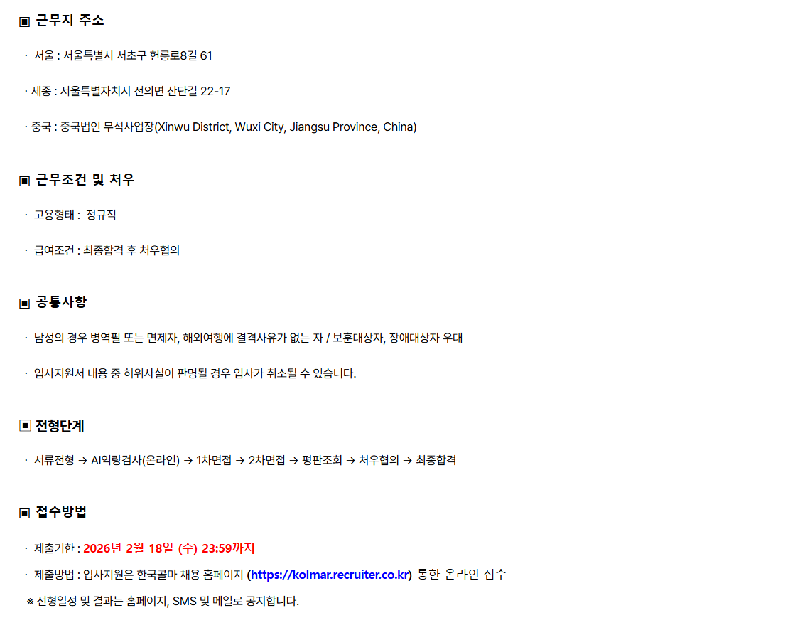¤ý Á¦Ãâ¹æ¹ý : ÀÔ»çÁö¿øÀº Çѱ¹Äݸ¶ ä¿ë ȨÆäÀÌÁö (https://kolmar.recruiter.co.kr) ÅëÇÑ ¿Â¶óÀÎ Á¢¼ö
