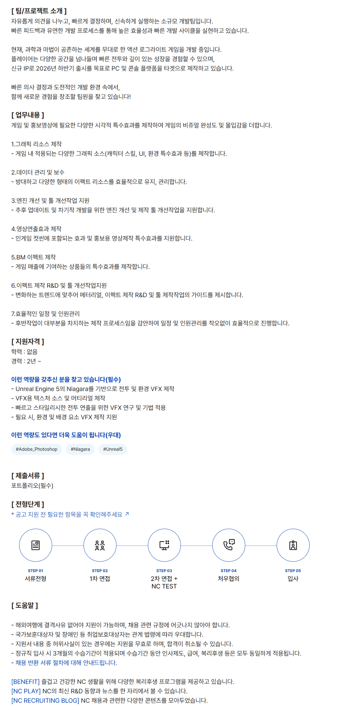 [ ÆÀ/ÇÁ·ÎÁ§Æ® ¼Ò°³ ] ÀÚÀ¯·Ó°Ô ÀǰßÀ» ³ª´©°í, ºü¸£°Ô °áÁ¤Çϸç, ½Å¼ÓÇÏ°Ô ½ÇÇàÇÏ´Â ¼Ò±Ô¸ð °³¹ßÆÀÀÔ´Ï´Ù. ºü¸¥ Çǵå¹é°ú À¯¿¬ÇÑ °³¹ß ÇÁ·Î¼¼½º¸¦ ÅëÇØ ³ôÀº È¿À²¼º°ú ºü¸¥ °³¹ß »çÀÌŬÀ» ½ÇÇöÇϰí ÀÖ½À´Ï´Ù. ÇöÀç, °úÇаú ¸¶¹ýÀÌ °øÁ¸ÇÏ´Â ¼¼°è¸¦ ¹«´ë·Î ÇÑ ¾×¼Ç ·Î±×¶óÀÌÆ® °ÔÀÓÀ» °³¹ß ÁßÀÔ´Ï´Ù. Ç÷¹À̾î´Â ´Ù¾çÇÑ °ø°£À» ³Ñ³ªµé¸ç ºü¸¥ ÀüÅõ¿Í ±íÀÌ ÀÖ´Â ¼ºÀåÀ» °æÇèÇÒ ¼ö ÀÖÀ¸¸ç, ½Å±Ô IP·Î 2026³â ÇϹݱâ Ãâ½Ã¸¦ ¸ñÇ¥·Î PC ¹× ÄÜ¼Ö Ç÷§ÆûÀ» Ÿ°ÙÀ¸·Î Á¦ÀÛÇϰí ÀÖ½À´Ï´Ù. ºü¸¥ ÀÇ»ç °áÁ¤°ú µµÀüÀûÀÎ °³¹ß ȯ°æ ¼Ó¿¡¼­, ÇÔ²² »õ·Î¿î °æÇèÀ» âÁ¶ÇÒ ÆÀ¿øÀ» ã°í ÀÖ½À´Ï´Ù! [ ¾÷¹«³»¿ë ] °ÔÀÓ ¹× È«º¸¿µ»ó¿¡ ÇÊ¿äÇÑ ´Ù¾çÇÑ ½Ã°¢Àû Ư¼öÈ¿°ú¸¦ Á¦ÀÛÇÏ¿© °ÔÀÓÀÇ ºñÁê¾ó ¿Ï¼ºµµ ¹× ¸ôÀÔ°¨À» ´õÇÕ´Ï´Ù. 1.±×·¡ÇÈ ¸®¼Ò½º Á¦ÀÛ - °ÔÀÓ ³» Àû¿ëµÇ´Â ´Ù¾çÇÑ ±×·¡ÇÈ ¼Ò½º(ij¸¯ÅÍ ½ºÅ³, UI, ȯ°æ Ư¼öÈ¿°ú µî)¸¦ Á¦ÀÛÇÕ´Ï´Ù. 2.µ¥ÀÌÅÍ °ü¸® ¹× º¸¼ö - ¹æ´ëÇÏ°í ´Ù¾çÇÑ ÇüÅÂÀÇ ÀÌÆåÆ® ¸®¼Ò½º¸¦ È¿À²ÀûÀ¸·Î À¯Áö, °ü¸®ÇÕ´Ï´Ù. 3.¿£Áø °³¼± ¹× Åø °³¼±ÀÛ¾÷ Áö¿ø - ÃßÈÄ ¾÷µ¥ÀÌÆ® ¹× Â÷±âÀÛ °³¹ßÀ» À§ÇÑ ¿£Áø °³¼± ¹× Á¦ÀÛ Åø °³¼±ÀÛ¾÷À» Áö¿øÇÕ´Ï´Ù. 4.¿µ»ó¿¬ÃâÈ¿°ú Á¦ÀÛ - ÀΰÔÀÓ ÄÆ¾À¿¡ Æ÷ÇԵǴ ȿ°ú ¹× È«º¸¿ë ¿µ»óÁ¦ÀÛ Æ¯¼öÈ¿°ú¸¦ Áö¿øÇÕ´Ï´Ù. 5.BM ÀÌÆåÆ® Á¦ÀÛ - °ÔÀÓ ¸ÅÃâ¿¡ ±â¿©ÇÏ´Â »óǰµéÀÇ Æ¯¼öÈ¿°ú¸¦ Á¦ÀÛÇÕ´Ï´Ù.