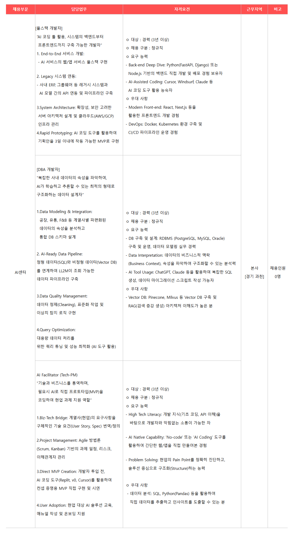 [±¤µ¿Á¦¾à] AI¼¾ÅÍ Ç®½ºÅð³¹ßÀÚ, DBA°³¹ßÀÚ, AI Facilitator °æ·ÂÁ÷¿ø ¸ðÁý