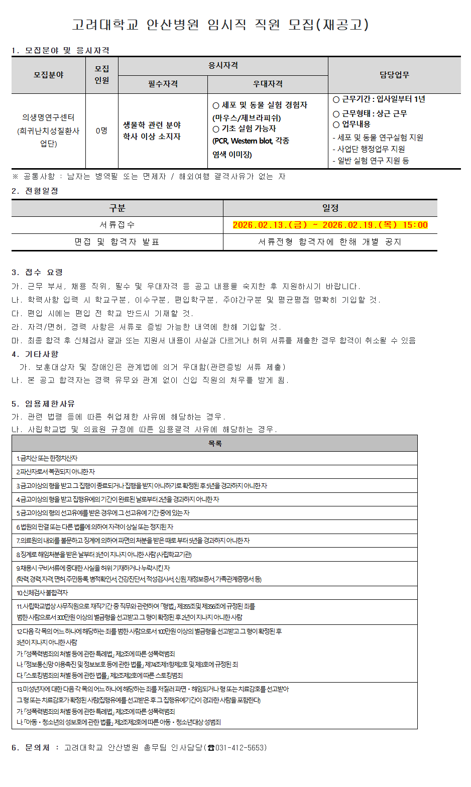 °í·Á´ëÇб³ ¾È»êº´¿ø ÀÓ½ÃÁ÷ Á÷¿ø ¸ðÁý(Àç°ø°í)