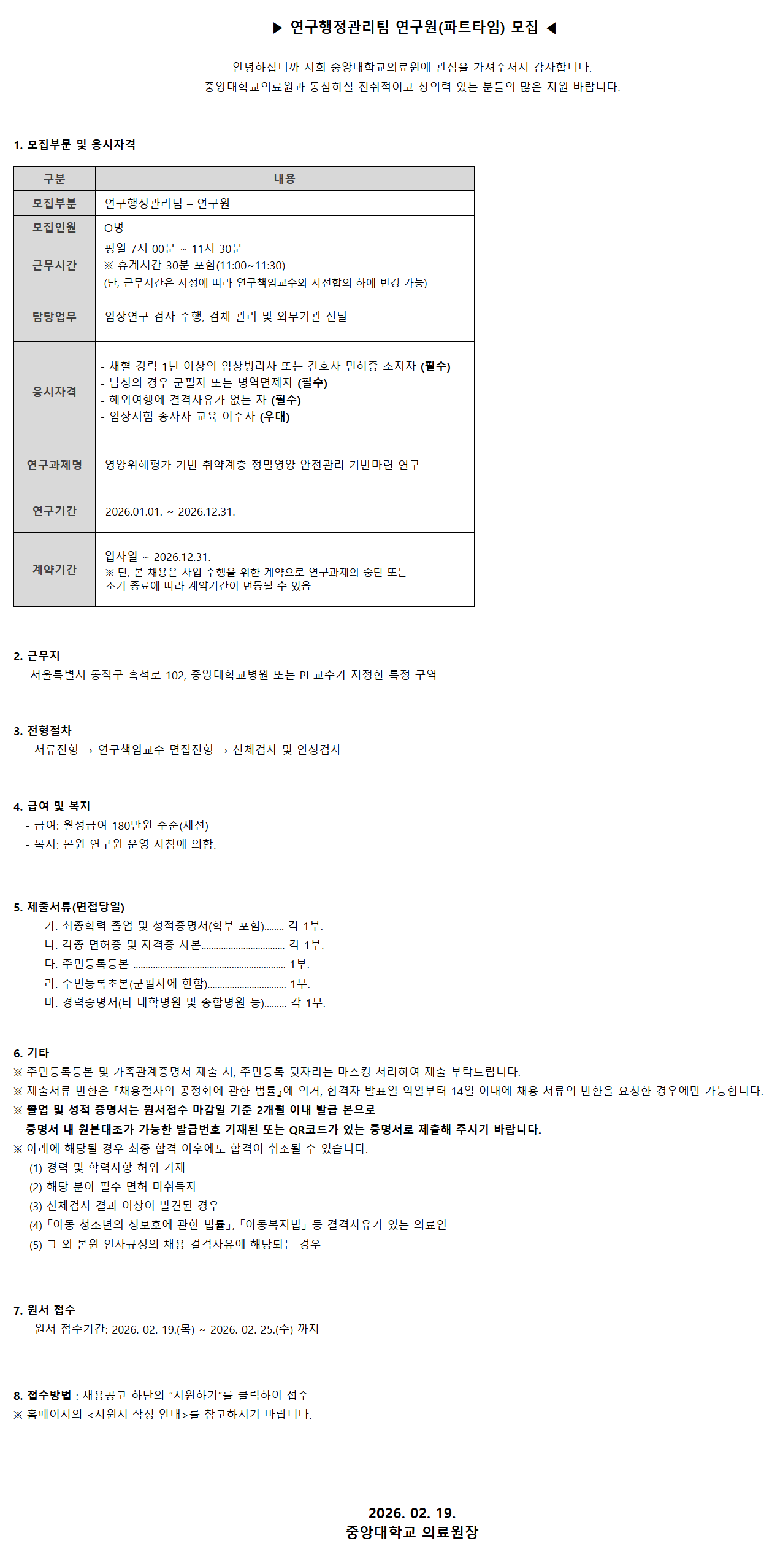 ¢º ¿¬±¸ÇàÁ¤°ü¸®ÆÀ ¿¬±¸¿ø(ÆÄƮŸÀÓ) ¸ðÁý ¢¸ ¾È³çÇϽʴϱî ÀúÈñ Áß¾Ó´ëÇб³ÀÇ·á¿ø¿¡ °ü½ÉÀ» °¡Á®Áּż­ °¨»çÇÕ´Ï´Ù. Áß¾Ó´ëÇб³ÀÇ·á¿ø°ú µ¿ÂüÇÏ½Ç ÁøÃëÀûÀ̰í âÀÇ·Â ÀÖ´Â ºÐµéÀÇ ¸¹Àº Áö¿ø ¹Ù¶ø´Ï´Ù. 1. ¸ðÁýºÎ¹® ¹× ÀÀ½ÃÀÚ°Ý ±¸ºÐ ³»¿ë ¸ðÁýºÎºÐ ¿¬±¸ÇàÁ¤°ü¸®ÆÀ – ¿¬±¸¿ø ¸ðÁýÀοø O¸í ±Ù¹«½Ã°£ ÆòÀÏ 7½Ã 00ºÐ ~ 11½Ã 30ºÐ ¡Ø ÈްԽð£ 30ºÐ Æ÷ÇÔ(11:00~11:30) (´Ü, ±Ù¹«½Ã°£Àº »çÁ¤¿¡ µû¶ó ¿¬±¸Ã¥ÀÓ±³¼ö¿Í »çÀüÇÕÀÇ ÇÏ¿¡ º¯°æ °¡´É) ´ã´ç¾÷¹« Àӻ󿬱¸ °Ë»ç ¼öÇà, °Ëü °ü¸® ¹× ¿ÜºÎ±â°ü Àü´Þ ÀÀ½ÃÀÚ°Ý - äÇ÷ °æ·Â 1³â ÀÌ»óÀÇ ÀÓ»óº´¸®»ç ¶Ç´Â °£È£»ç ¸éÇãÁõ ¼ÒÁöÀÚ (Çʼö) - ³²¼ºÀÇ °æ¿ì ±ºÇÊÀÚ ¶Ç´Â º´¿ª¸éÁ¦ÀÚ (Çʼö) - ÇØ¿Ü¿©Çà¿¡ °á°Ý»çÀ¯°¡ ¾ø´Â ÀÚ (Çʼö) - ÀÓ»ó½ÃÇè Á¾»çÀÚ ±³À° À̼öÀÚ (¿ì´ë) ¿¬±¸°úÁ¦¸í ¿µ¾çÀ§ÇØÆò°¡ ±â¹Ý Ãë¾à°èÃþ Á¤¹Ð¿µ¾ç ¾ÈÀü°ü¸® ±â¹Ý¸¶·Ã ¿¬±¸ ¿¬±¸±â°£ 2026.01.01. ~ 2026.12.31. °è¾à±â°£ ÀÔ»çÀÏ ~ 2026.12.31. ¡Ø ´Ü, º» ä¿ëÀº »ç¾÷ ¼öÇàÀ» À§ÇÑ °è¾àÀ¸·Î ¿¬±¸°úÁ¦ÀÇ Áß´Ü ¶Ç´Â Á¶±â Á¾·á¿¡ µû¶ó °è¾à±â°£ÀÌ º¯µ¿µÉ ¼ö ÀÖÀ½ 2. ±Ù¹«Áö - ¼­¿ïƯº°½Ã µ¿ÀÛ±¸ Èæ¼®·Î 102, Áß¾Ó´ëÇб³º´¿ø ¶Ç´Â PI ±³¼ö°¡ ÁöÁ¤ÇÑ Æ¯Á¤ ±¸¿ª 3. ÀüÇüÀýÂ÷ - ¼­·ùÀüÇü ¡æ ¿¬±¸Ã¥ÀÓ±³¼ö ¸éÁ¢ÀüÇü ¡æ ½Åü°Ë»ç ¹× Àμº°Ë»ç 4. ±Þ¿© ¹× º¹Áö - ±Þ¿©: ¿ùÁ¤±Þ¿© 180¸¸¿ø ¼öÁØ(¼¼Àü) - º¹Áö: º»¿ø ¿¬±¸¿ø ¿î¿µ Áöħ¿¡ ÀÇÇÔ. 5. Á¦Ãâ¼­·ù(¸éÁ¢´çÀÏ) °¡. ÃÖÁ¾Çз Á¹¾÷ ¹× ¼ºÀûÁõ¸í¼­(ÇкΠÆ÷ÇÔ)........ °¢ 1ºÎ. ³ª. °¢Á¾ ¸éÇãÁõ ¹× ÀÚ°ÝÁõ »çº».................................. °¢ 1ºÎ. ´Ù. Áֹεî·Ïµîº» .............................................................. 1ºÎ. ¶ó. Áֹεî·ÏÃʺ»(±ºÇÊÀÚ¿¡ ÇÑÇÔ)................................ 1ºÎ. ¸¶. °æ·ÂÁõ¸í¼­(Ÿ ´ëÇк´¿ø ¹× Á¾ÇÕº´¿ø µî)......... °¢ 1ºÎ. 6. ±âŸ ¡Ø Áֹεî·Ïµîº» ¹× °¡Á·°ü°èÁõ¸í¼­ Á¦Ãâ ½Ã, Áֹεî·Ï µÞÀÚ¸®´Â ¸¶½ºÅ· ó¸®ÇÏ¿© Á¦Ãâ ºÎŹµå¸³´Ï´Ù. ¡Ø Á¦Ãâ¼­·ù ¹ÝȯÀº ¡ºÃ¤¿ëÀýÂ÷ÀÇ °øÁ¤È­¿¡ °üÇÑ ¹ý·ü¡»¿¡ ÀǰÅ, ÇÕ°ÝÀÚ ¹ßÇ¥ÀÏ ÀÍÀϺÎÅÍ 14ÀÏ À̳»¿¡ ä¿ë ¼­·ùÀÇ ¹ÝȯÀ» ¿äûÇÑ °æ¿ì¿¡¸¸ °¡´ÉÇÕ´Ï´Ù. ¡Ø Á¹¾÷ ¹× ¼ºÀû Áõ¸í¼­´Â ¿ø¼­Á¢¼ö ¸¶°¨ÀÏ ±âÁØ 2°³¿ù À̳» ¹ß±Þ º»À¸·Î Áõ¸í¼­ ³» ¿øº»´ëÁ¶°¡ °¡´ÉÇÑ ¹ß±Þ¹øÈ£ ±âÀçµÈ ¶Ç´Â QRÄڵ尡 ÀÖ´Â Áõ¸í¼­·Î Á¦ÃâÇØ Áֽñ⠹ٶø´Ï´Ù. ¡Ø ¾Æ·¡¿¡ ÇØ´çµÉ °æ¿ì ÃÖÁ¾ ÇÕ°Ý ÀÌÈÄ¿¡µµ ÇÕ°ÝÀÌ Ãë¼ÒµÉ ¼ö ÀÖ½À´Ï´Ù. (1) °æ·Â ¹× Çз»çÇ× ÇãÀ§ ±âÀç (2) ÇØ´ç ºÐ¾ß Çʼö ¸éÇã ¹ÌÃëµæÀÚ (3) ½Åü°Ë»ç °á°ú ÀÌ»óÀÌ ¹ß°ßµÈ °æ¿ì (4) ¡¸¾Æµ¿ û¼Ò³âÀÇ ¼ºº¸È£¿¡ °üÇÑ ¹ý·ü¡¹, ¡¸¾Æµ¿º¹Áö¹ý¡¹ µî °á°Ý»çÀ¯°¡ ÀÖ´Â ÀÇ·áÀÎ (5) ±× ¿Ü º»¿ø Àλç±ÔÁ¤ÀÇ Ã¤¿ë °á°Ý»çÀ¯¿¡ ÇØ´çµÇ´Â °æ¿ì 7. ¿ø¼­ Á¢¼ö - ¿ø¼­ Á¢¼ö±â°£: 2026. 02. 19.(¸ñ) ~ 2026. 02. 25.(¼ö) ±îÁö 8. Á¢¼ö¹æ¹ý : ä¿ë°ø°í ÇÏ´ÜÀÇ ¡°Áö¿øÇϱ⡱¸¦ Ŭ¸¯ÇÏ¿© Á¢¼ö ¡Ø ȨÆäÀÌÁöÀÇ <Áö¿ø¼­ ÀÛ¼º ¾È³»>¸¦ Âü°íÇϽñ⠹ٶø´Ï´Ù. 2026. 02. 19. Áß¾Ó´ëÇб³ ÀÇ·á¿øÀå