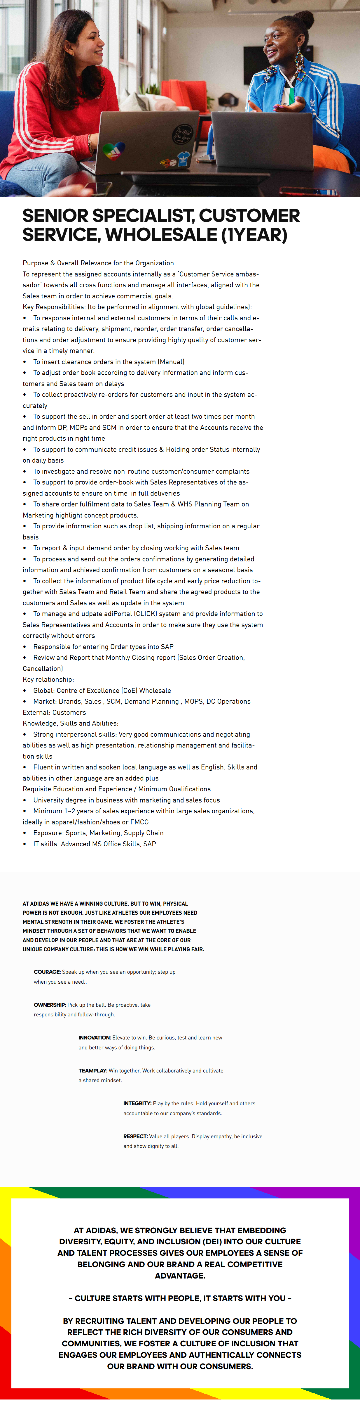 Senior Specialist, Customer Service, Wholesale (1Year) Purpose & Overall Relevance for the Organization: To represent the assigned accounts internally as a ¡®Customer Service ambassador¡® towards all cross functions and manage all interfaces, aligned with the Sales team in order to achieve commercial goals. Key Responsibilities: (to be performed in alignment with global guidelines): • To response internal and external customers in terms of their calls and e-mails relating to delivery, shipment, reorder, order transfer, order cancellations and order adjustment to ensure providing highly quality of customer service in a timely manner. • To insert clearance orders in the system (Manual) • To adjust order book according to delivery information and inform customers and Sales team on delays • To collect proactively re-orders for customers and input in the system accurately • To support the sell in order and sport order at least two times per month and inform DP, MOPs and SCM in order to ensure that the Accounts receive the right products in right time • To support to communicate credit issues & Holding order Status internally on daily basis • To investigate and resolve non-routine customer/consumer complaints • To support to provide order-book with Sales Representatives of the assigned accounts to ensure on time in full deliveries • To share order fulfilment data to Sales Team & WHS Planning Team on Marketing highlight concept products. • To provide information such as drop list, shipping information on a regular basis • To report & input demand order by closing working with Sales team • To process and send out the orders confirmations by generating detailed information and achieved confirmation from customers on a seasonal basis • To collect the information of product life cycle and early price reduction together with Sales Team and Retail Team and share the agreed products to the customers and Sales as well as update in the system • To manage and udpate adiPortal (CLICK) system and provide information to Sales Representatives and Accounts in order to make sure they use the system correctly without errors • Responsible for entering Order types into SAP • Review and Report that Monthly Closing report (Sales Order Creation, Cancellation) Key relationship: • Global: Centre of Excellence (CoE) Wholesale • Market: Brands, Sales , SCM, Demand Planning , MOPS, DC Operations External: Customers Knowledge, Skills and Abilities: • Strong interpersonal skills: Very good communications and negotiating abilities as well as high presentation, relationship management and facilitation skills • Fluent in written and spoken local language as well as English. Skills and abilities in other language are an added plus Requisite Education and Experience / Minimum Qualifications: • University degree in business with marketing and sales focus • Minimum 1~2 years of sales experience within large sales organizations, ideally in apparel/fashion/shoes or FMCG • Exposure: Sports, Marketing, Supply Chain • IT skills: Advanced MS Office Skills, SAP AT ADIDAS WE HAVE A WINNING CULTURE. BUT TO WIN, PHYSICAL POWER IS NOT ENOUGH. JUST LIKE ATHLETES OUR EMPLOYEES NEED MENTAL STRENGTH IN THEIR GAME. WE FOSTER THE ATHLETE¡¯S MINDSET THROUGH A SET OF BEHAVIORS THAT WE WANT TO ENABLE AND DEVELOP IN OUR PEOPLE AND THAT ARE AT THE CORE OF OUR UNIQUE COMPANY CULTURE: THIS IS HOW WE WIN WHILE PLAYING FAIR. COURAGE: Speak up when you see an opportunity; step up when you see a need.. OWNERSHIP: Pick up the ball. Be proactive, take responsibility and follow-through. INNOVATION: Elevate to win. Be curious, test and learn new and better ways of doing things. TEAMPLAY: Win together. Work collaboratively and cultivate a shared mindset. INTEGRITY: Play by the rules. Hold yourself and others accountable to our company¡¯s standards. RESPECT: Value all players. Display empathy, be inclusive and show dignity to all. At adidas, we strongly believe that embedding diversity, equity, and inclusion (DEI) into our culture and talent processes gives our employees a sense of belonging and our brand a real competitive advantage. – Culture Starts With People, It Starts With You – By recruiting talent and developing our people to reflect the rich diversity of our consumers and communities, we foster a culture of inclusion that engages our employees and authentically connects our brand with our consumers.