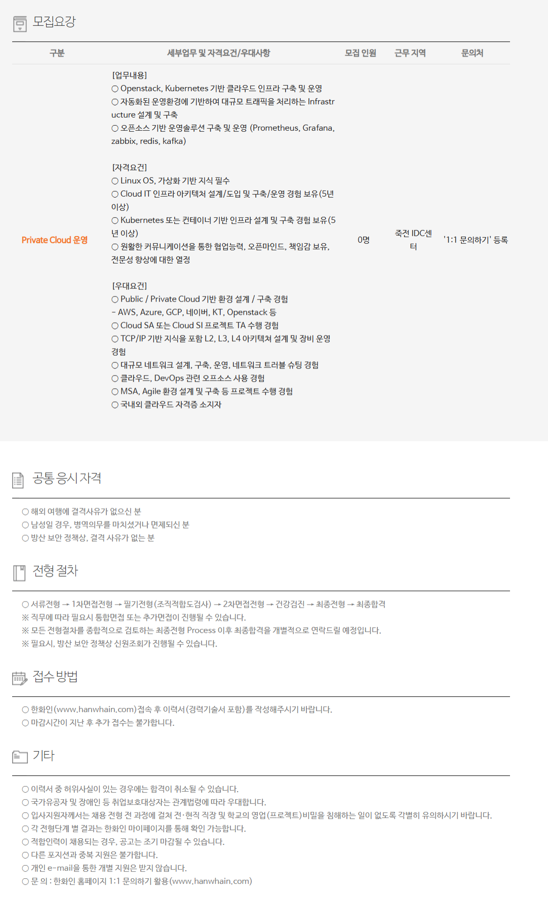 [¾÷¹«³»¿ë] ¡Û Openstack, Kubernetes ±â¹Ý Ŭ¶ó¿ìµå ÀÎÇÁ¶ó ±¸Ãà ¹× ¿î¿µ ¡Û ÀÚµ¿È­µÈ ¿î¿µÈ¯°æ¿¡ ±â¹ÝÇÏ¿© ´ë±Ô¸ð Æ®·¡ÇÈÀ» ó¸®ÇÏ´Â Infrastructure ¼³°è ¹× ±¸Ãà ¡Û ¿ÀǼҽº ±â¹Ý ¿î¿µ¼Ö·ç¼Ç ±¸Ãà ¹× ¿î¿µ (Prometheus, Grafana, zabbix, redis, kafka) [ÀÚ°Ý¿ä°Ç] ¡Û Linux OS, °¡»óÈ­ ±â¹Ý Áö½Ä Çʼö ¡Û Cloud IT ÀÎÇÁ¶ó ¾ÆÅ°ÅØÃ³ ¼³°è/µµÀÔ ¹× ±¸Ãà/¿î¿µ °æÇè º¸À¯(5³â ÀÌ»ó) ¡Û Kubernetes ¶Ç´Â ÄÁÅ×ÀÌ³Ê ±â¹Ý ÀÎÇÁ¶ó ¼³°è ¹× ±¸Ãà °æÇè º¸À¯(5³â ÀÌ»ó) ¡Û ¿øÈ°ÇÑ Ä¿¹Â´ÏÄÉÀ̼ÇÀ» ÅëÇÑ Çù¾÷´É·Â, ¿ÀǸ¶Àεå, Ã¥ÀÓ°¨ º¸À¯, Àü¹®¼º Çâ»ó¿¡ ´ëÇÑ ¿­Á¤ [¿ì´ë¿ä°Ç] ¡Û Public / Private Cloud ±â¹Ý ȯ°æ ¼³°è / ±¸Ãà °æÇè - AWS, Azure, GCP, ³×À̹ö, KT, Openstack µî ¡Û Cloud SA ¶Ç´Â Cloud SI ÇÁ·ÎÁ§Æ® TA ¼öÇà °æÇè ¡Û TCP/IP ±â¹Ý Áö½ÄÀ» Æ÷ÇÔ L2, L3, L4 ¾ÆÅ°ÅØÃÄ ¼³°è ¹× Àåºñ ¿î¿µ °æÇè ¡Û ´ë±Ô¸ð ³×Æ®¿öÅ© ¼³°è, ±¸Ãà, ¿î¿µ, ³×Æ®¿öÅ© Æ®·¯ºí ½´ÆÃ °æÇè ¡Û Å¬¶ó¿ìµå, DevOps °ü·Ã ¿ÀÇÁ¼Ò½º »ç¿ë °æÇè ¡Û MSA, Agile ȯ°æ ¼³°è ¹× ±¸Ãà µî ÇÁ·ÎÁ§Æ® ¼öÇà °æÇè ¡Û ±¹³»¿Ü Ŭ¶ó¿ìµå ÀÚ°ÝÁõ ¼ÒÁöÀÚ