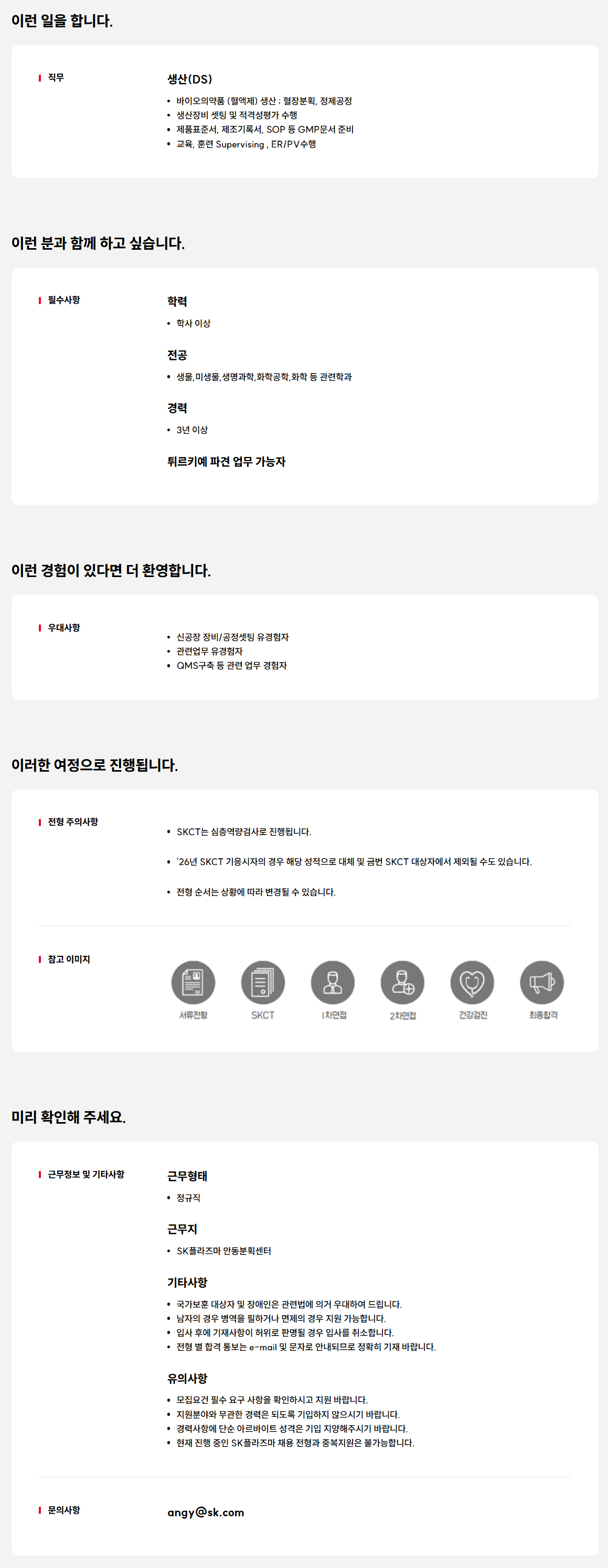 ÀÌ·± ÀÏÀ» ÇÕ´Ï´Ù. Á÷¹« »ý»ê(DS) ¹ÙÀÌ¿ÀÀǾàǰ (Ç÷¾×Á¦) »ý»ê ; Ç÷ÀåºÐȹ, Á¤Á¦°øÁ¤ »ý»êÀåºñ ¼ÂÆÃ ¹× Àû°Ý¼ºÆò°¡ ¼öÇà Á¦Ç°Ç¥Áؼ­, Á¦Á¶±â·Ï¼­, SOP µî GMP¹®¼­ Áغñ ±³À°, ÈÆ·Ã Supervising , ER/PV¼öÇà ÀÌ·± ºÐ°ú ÇÔ²² ÇÏ°í ½Í½À´Ï´Ù. Çʼö»çÇ× Çз Çлç ÀÌ»ó Àü°ø »ý¹°,¹Ì»ý¹°,»ý¸í°úÇÐ,È­ÇаøÇÐ,È­ÇÐ µî °ü·ÃÇаú °æ·Â 3³â ÀÌ»ó Æ¢¸£Å°¿¹ ÆÄ°ß ¾÷¹« °¡´ÉÀÚ ÀÌ·± °æÇèÀÌ ÀÖ´Ù¸é ´õ ȯ¿µÇÕ´Ï´Ù. ¿ì´ë»çÇ× ½Å°øÀå Àåºñ/°øÁ¤¼ÂÆÃ À¯°æÇèÀÚ °ü·Ã¾÷¹« À¯°æÇèÀÚ QMS±¸Ãà µî °ü·Ã ¾÷¹« °æÇèÀÚ