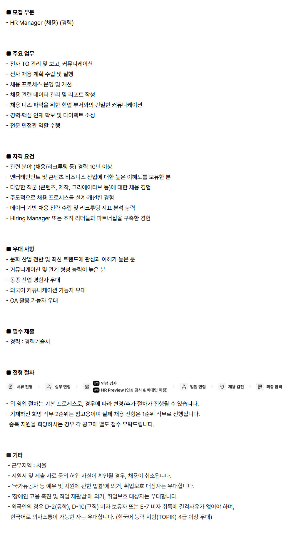 [JYP ENTERTAINMENT] HR Manager (ä¿ë) (°æ·Â)