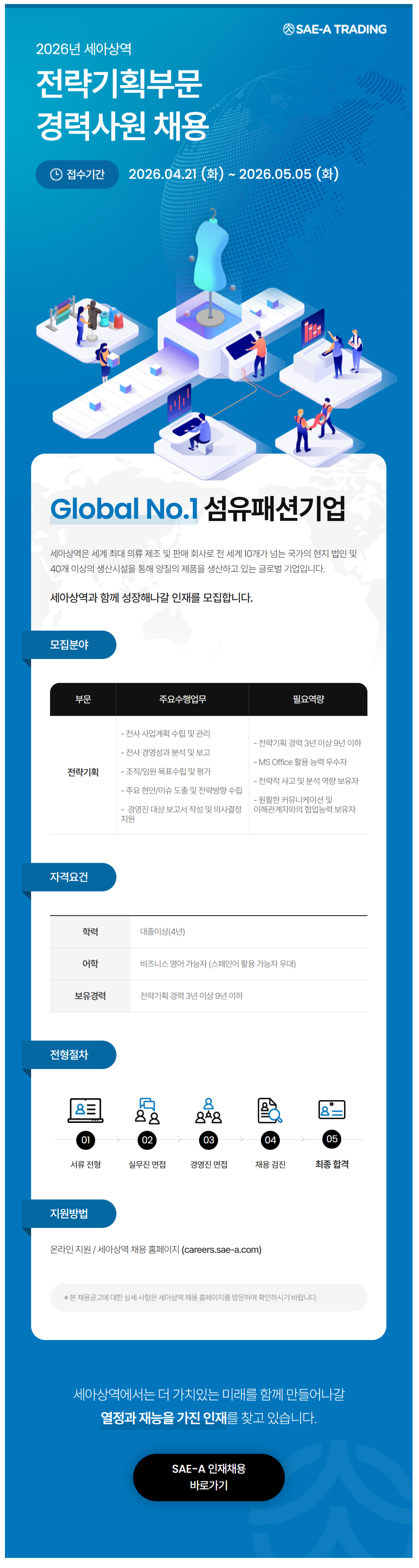 Àü·«±âȹ - Àü»ç »ç¾÷°èȹ ¼ö¸³ ¹× °ü¸® - Àü»ç °æ¿µ¼º°ú ºÐ¼® ¹× º¸°í - Á¶Á÷/ÀÓ¿ø ¸ñÇ¥¼ö¸³ ¹× Æò°¡ - ÁÖ¿ä Çö¾È/À̽´ µµÃâ ¹× Àü·«¹æÇâ ¼ö¸³ - °æ¿µÁø ´ë»ó º¸°í¼­ ÀÛ¼º ¹× ÀÇ»ç°áÁ¤ Áö¿ø - Àü·«±âȹ °æ·Â 3³â ÀÌ»ó 9³â ÀÌÇÏ - MS Office Ȱ¿ë ´É·Â ¿ì¼öÀÚ - Àü·«Àû »ç°í ¹× ºÐ¼® ¿ª·® º¸À¯ÀÚ - ¿øÈ°ÇÑ Ä¿¹Â´ÏÄÉÀÌ¼Ç ¹× ÀÌÇØ°ü°èÀÚ¿ÍÀÇ Çù¾÷´É·Â º¸À¯ÀÚ