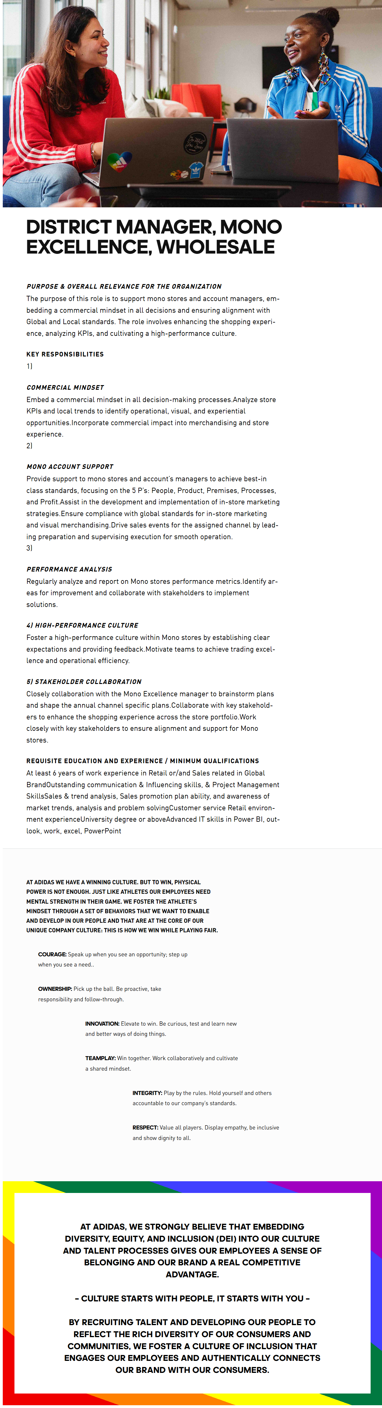 District Manager, Mono Excellence, Wholesale Purpose & Overall Relevance for the Organization The purpose of this role is to support mono stores and account managers, embedding a commercial mindset in all decisions and ensuring alignment with Global and Local standards. The role involves enhancing the shopping experience, analyzing KPIs, and cultivating a high-performance culture. Key Responsibilities 1) Commercial Mindset Embed a commercial mindset in all decision-making processes.Analyze store KPIs and local trends to identify operational, visual, and experiential opportunities.Incorporate commercial impact into merchandising and store experience. 2) Mono Account Support Provide support to mono stores and account¡¯s managers to achieve best-in class standards, focusing on the 5 P¡¯s: People, Product, Premises, Processes, and Profit.Assist in the development and implementation of in-store marketing strategies.Ensure compliance with global standards for in-store marketing and visual merchandising.Drive sales events for the assigned channel by leading preparation and supervising execution for smooth operation. 3) Performance Analysis Regularly analyze and report on Mono stores performance metrics.Identify areas for improvement and collaborate with stakeholders to implement solutions. 4) High-Performance Culture Foster a high-performance culture within Mono stores by establishing clear expectations and providing feedback.Motivate teams to achieve trading excellence and operational efficiency. 5) Stakeholder Collaboration Closely collaboration with the Mono Excellence manager to brainstorm plans and shape the annual channel specific plans.Collaborate with key stakeholders to enhance the shopping experience across the store portfolio.Work closely with key stakeholders to ensure alignment and support for Mono stores. Requisite Education and Experience / Minimum Qualifications At least 6 years of work experience in Retail or/and Sales related in Global BrandOutstanding communication & Influencing skills, & Project Management SkillsSales & trend analysis, Sales promotion plan ability, and awareness of market trends, analysis and problem solvingCustomer service Retail environment experienceUniversity degree or aboveAdvanced IT skills in Power BI, outlook, work, excel, PowerPoint AT ADIDAS WE HAVE A WINNING CULTURE. BUT TO WIN, PHYSICAL POWER IS NOT ENOUGH. JUST LIKE ATHLETES OUR EMPLOYEES NEED MENTAL STRENGTH IN THEIR GAME. WE FOSTER THE ATHLETE¡¯S MINDSET THROUGH A SET OF BEHAVIORS THAT WE WANT TO ENABLE AND DEVELOP IN OUR PEOPLE AND THAT ARE AT THE CORE OF OUR UNIQUE COMPANY CULTURE: THIS IS HOW WE WIN WHILE PLAYING FAIR. COURAGE: Speak up when you see an opportunity; step up when you see a need.. OWNERSHIP: Pick up the ball. Be proactive, take responsibility and follow-through. INNOVATION: Elevate to win. Be curious, test and learn new and better ways of doing things. TEAMPLAY: Win together. Work collaboratively and cultivate a shared mindset. INTEGRITY: Play by the rules. Hold yourself and others accountable to our company¡¯s standards. RESPECT: Value all players. Display empathy, be inclusive and show dignity to all. At adidas, we strongly believe that embedding diversity, equity, and inclusion (DEI) into our culture and talent processes gives our employees a sense of belonging and our brand a real competitive advantage. – Culture Starts With People, It Starts With You – By recruiting talent and developing our people to reflect the rich diversity of our consumers and communities, we foster a culture of inclusion that engages our employees and authentically connects our brand with our consumers.